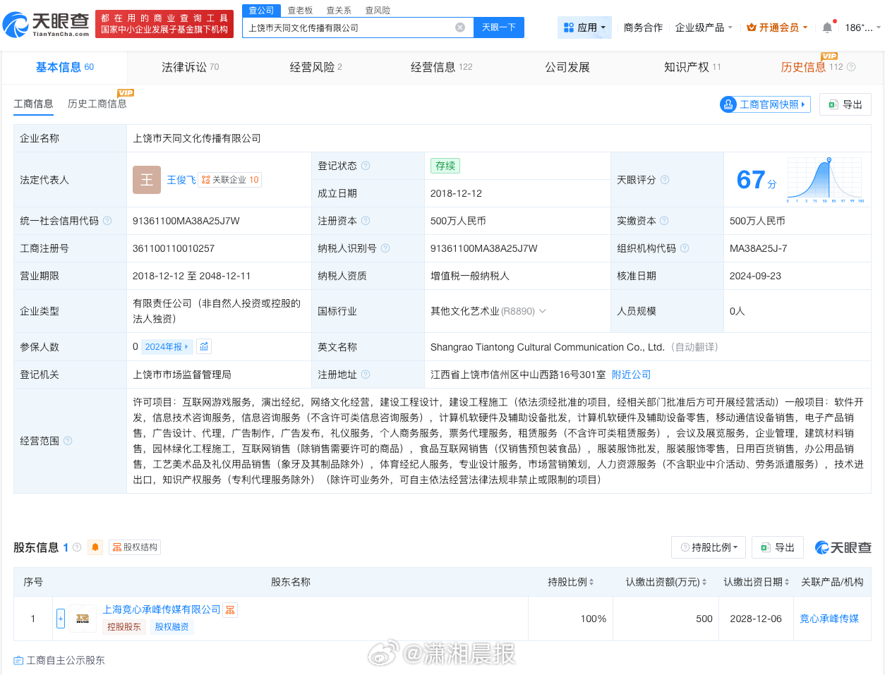 【#RNG关联公司被执行42.5万#】#RNG关联公司被执行#近日,记者查询天眼查信息显示,上饶市天同文化传播有限公司新增一则被执行人信息,执行标的42.5万余元,执行法院为上饶市信州区人民法院。上饶市天同文化传播有限公司成立于2018年12月,法定代表人为王俊飞,注册资本500万人民币,经营范围含互联网游戏服务、演出经纪、网络文化经营等。股东信息显示,该公司由上海竞心承峰传媒有限公司全资持股。