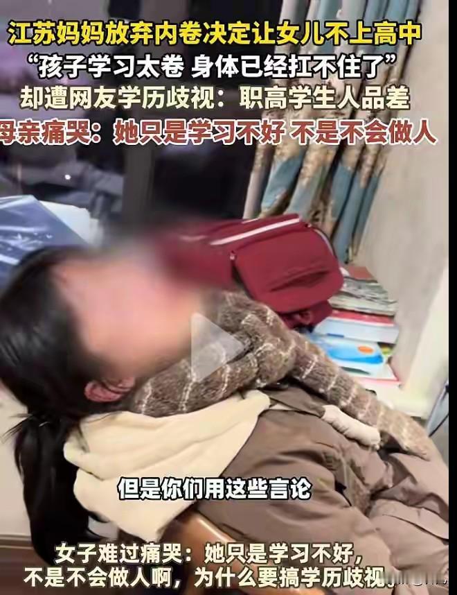 江苏妈妈放弃内卷决定让女儿读职高是“毁”女儿还是“救”女儿? 近日江苏妈妈的视频招来大家热议,很多人觉得选择职高等于毁了孩子的前途,觉得职高成才之路近乎为零。 可能大家对职高有误解,职高不是职业技术学校,职高也是高中,与普高文化课基本相同,就是加上自己喜欢的专业课。近年来国家对职高加大力度扶持,师资力量及学校管理都很到位。 江苏妈妈说女儿体弱多病,一直拖着残缺的病体硬撑着考入重点班,女儿对自己学习有要求,不甘落后,身体又吃不消,选择职高我认为是很正确的,职高毕业同样能考入大学。早早接触了自己所喜欢的专业更好。 条条大道通罗马,只要你有信念,身体健康,小众之路更容易到达罗马。 (图片来自网络)