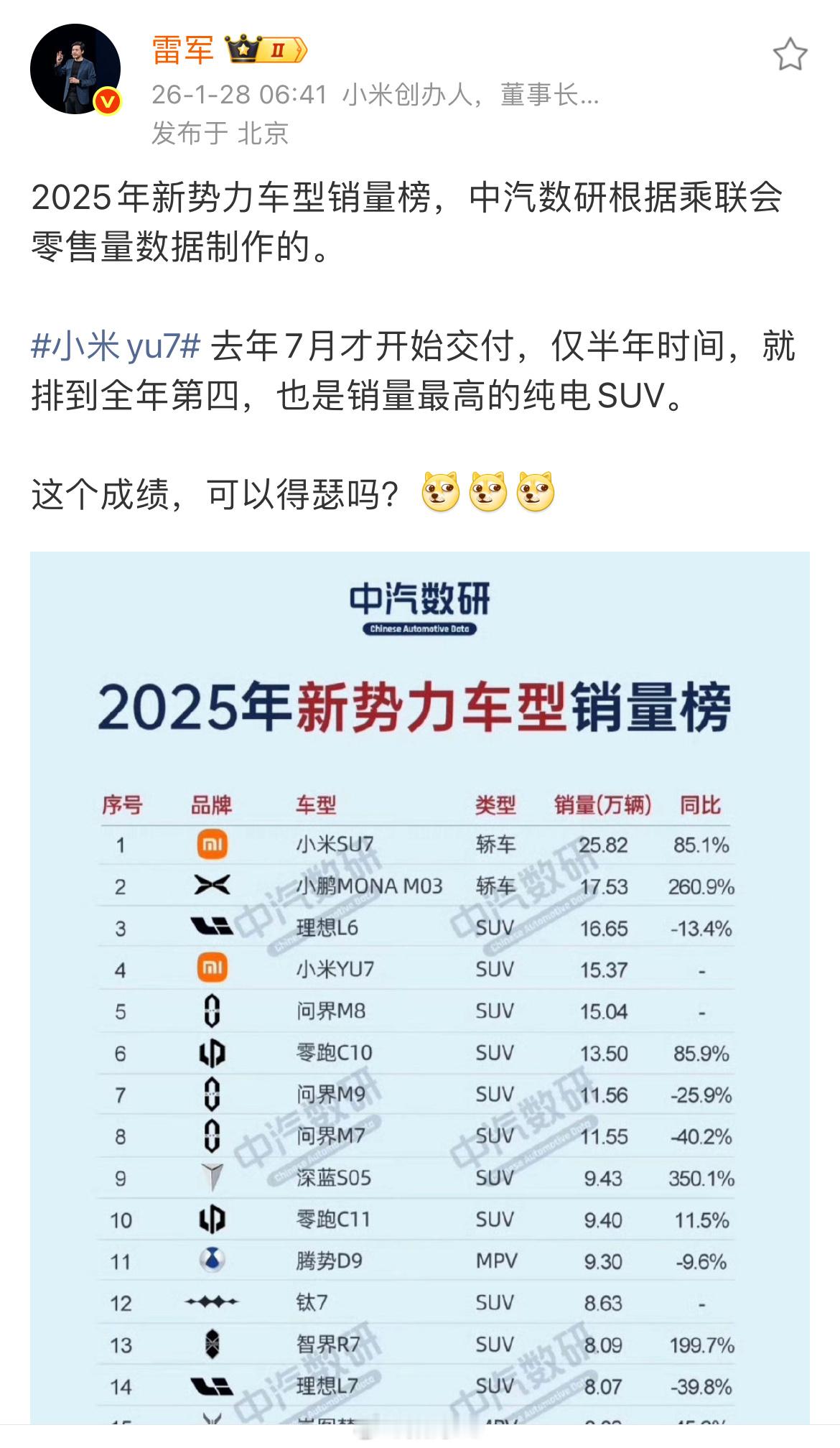 小米su7、小米YU7一个第一、第一第四,确实值得得瑟,今年YU7火力全开的话,成绩会更上一层楼