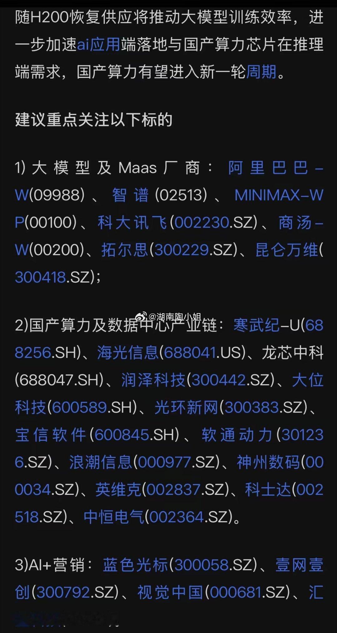 中国股市进入:震荡行情该怎么办?近期重点抓住主线之一:Ai应用进入震荡鱼尾行情的时候一个明显的特征就是:轮动!所以对大家选股看板块的要求就明显增高!今年的主线行情接下来肯定还是围绕科技!科技里除了半导体以外,Ai应用尤其值得关注!所以一定要清楚Ai应用有哪些细分!2025年四季度国内AIDC招标开始回暖并呈现上行趋势,2026年国内互联网大厂将加紧数据中心布局,且节奏或将快于2025年,若伴随H200恢复供应将推动大模型训练效率,进一步加速ai应用端落地与国产算力芯片在推理端需求,国产算力有望进入新一轮周期。