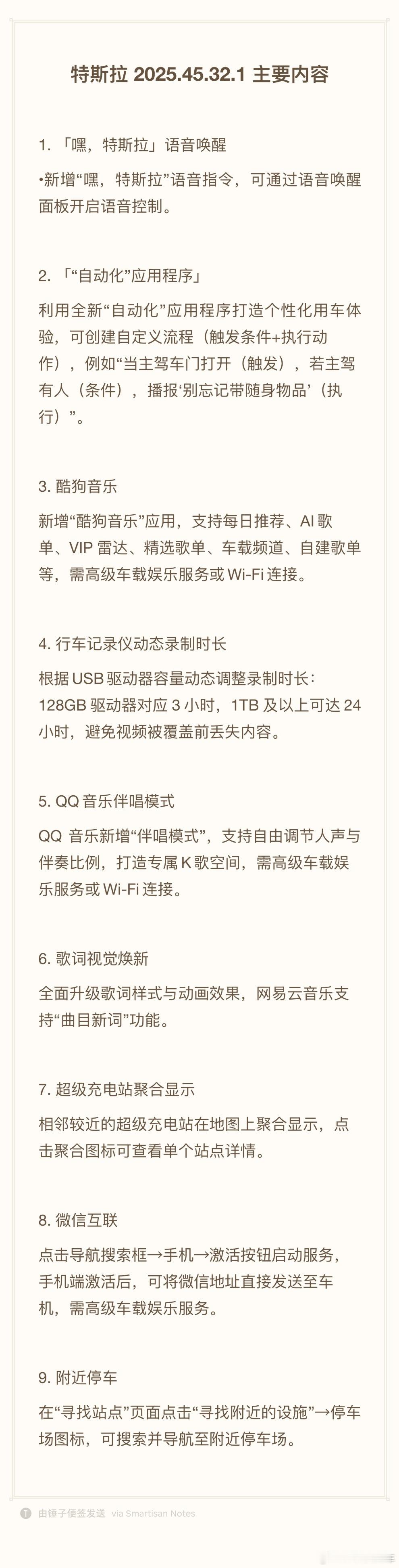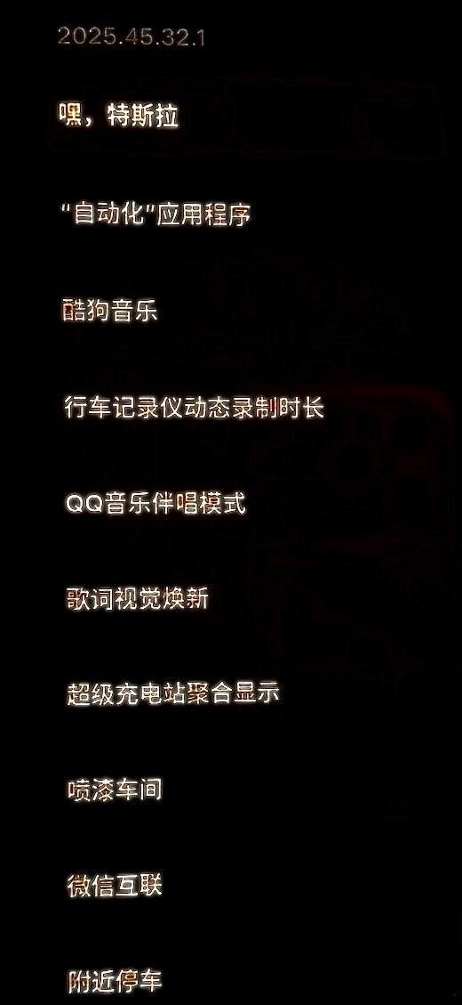 特斯拉2025.45.32.1版本主要升级内容:1. 新增「嘿,特斯拉」语音唤醒,可通过语音唤醒面板开启语音控制,2. 上线「自动化」应用程序,可创建触发条件+执行动作的自定义用车流程,3. 新增酷狗音乐应用,每日推荐、AI歌单、VIP雷达支持多种歌单与频道,4. 行车记录仪录制时长随USB容量动态调整,128GB为3小时、1TB及以上可达24小时,5. QQ音乐新增伴唱模式,支持自由调节人声与伴奏比例,6. 歌词视觉全面焕新,优化样式与动画效果,网易云音乐支持曲目新词功能,7. 超级充电站在地图上聚合显示相邻站点,点击可查看单个站点详情,8. 新增微信互联功能,手机端激活后可将微信地址直接发送至车机,9. 支持在寻找站点页面搜索并导航至附近停车场。(本内容来源于网络,以官方正式推送为准)。特斯拉新能源汽车