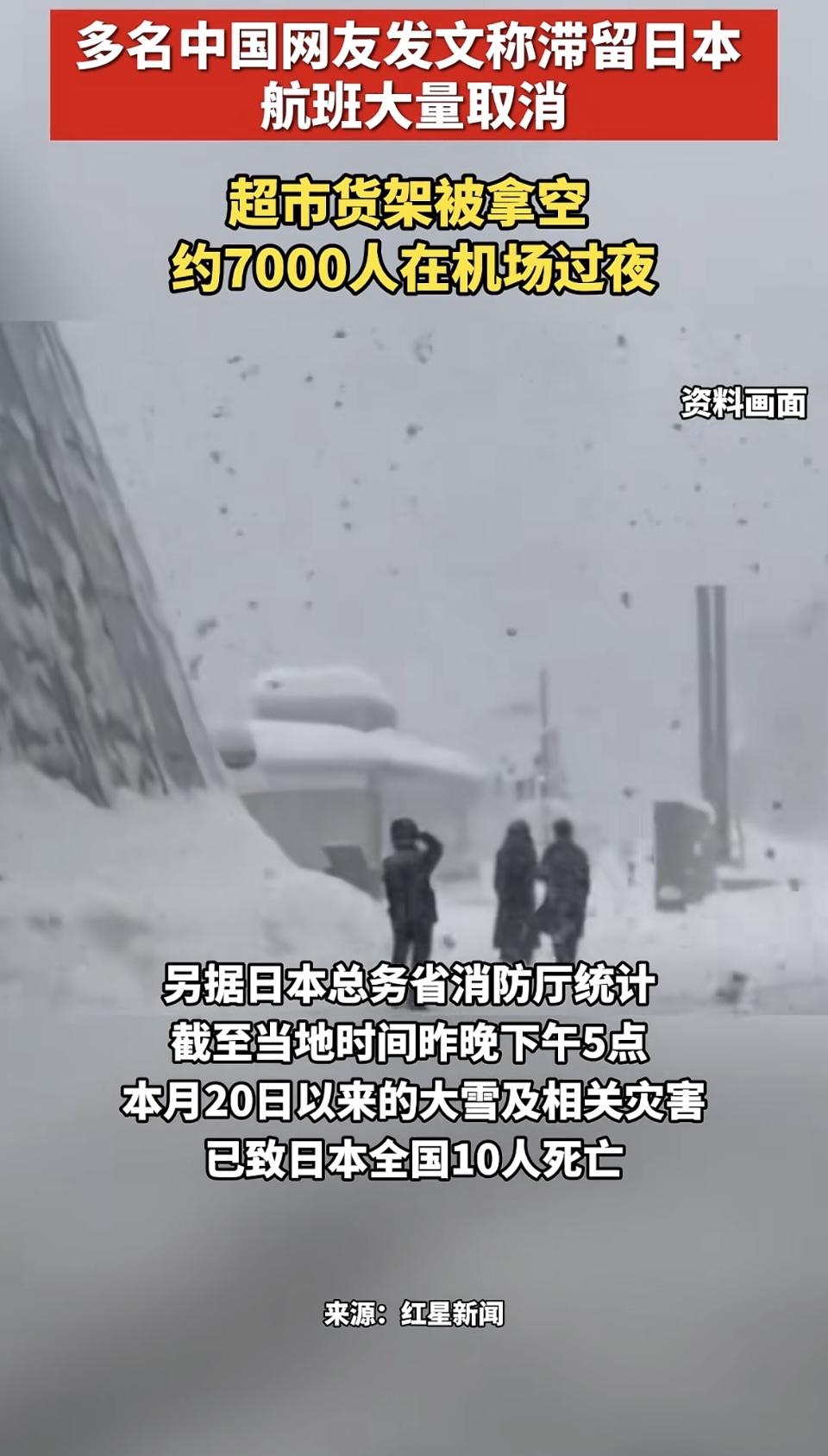 日本这大雪可太猛了,直接导致航班取消,7000人只能在机场过夜。想象一下,机场里满满当当全是人,大家原本的行程全被打乱,心情估计就跟这糟糕的天气一样。有人可能原本计划着去旅游,这下美景泡汤;有人或许赶着回家团聚,只能在机场干着急。机场里空间有限,这么多人挤在一起,吃喝休息都是问题。这大雪真是太不给面子了,希望天气赶紧好起来,让这些被困的人能早日踏上自己的旅程,别再在机场遭罪啦。 在这被困的人群里,有个年轻的背包客,他本打算去北海道看那如梦似幻的雪景,体验当地独特的雪祭活动。此刻,他只能无奈地坐在行李旁,望着窗外纷飞的大雪发呆,精心准备的摄影计划也只能搁置。 还有一位商务人士,他肩负着重要的合作洽谈任务,时间紧迫。在机场里,他不停地打着电话,试图重新安排行程,额头上满是焦虑的汗珠。 机场工作人员们也忙得不可开交,他们尽力协调资源,为被困旅客提供食物和毛毯。但面对数量如此庞大的人群,物资还是显得捉襟见肘。 随着时间的推移,夜幕降临,机场里的人们渐渐安静下来。大家都盼望着这场大雪能早点停下,让他们能尽快走出这临时的“牢笼”,去拥抱原本期待的生活。希望这场暴雪能快点过去,还大家一个正常的出行秩序。