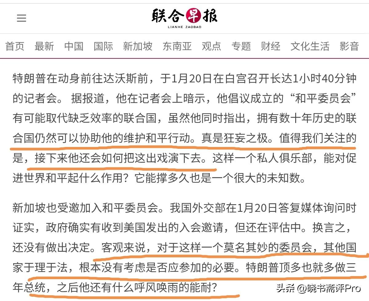 联合早报这一次一点面子也没有给特朗普!联合早报刊文痛批特朗普是自不量力!在特朗普对新加坡发出“和平委员会”的邀请通知之后,新加坡一直没有表态参加,现在反倒是联合早报站出来了。1月28日,联合早报刊文声称,特朗普成立的竟然是个私人俱乐部式的所谓“国际组织”,由特朗普担任主席,拥有唯一的否决权和委任权。 这个委员会的章程只字不提加沙,而是放眼天下,甚至和联合国相提并论。联合早报不客气的表示,也不知特朗普是哪来的底气?美国欲打造一个与联合国平行的机构,这将进一步破坏联合国权威和工作机制。但这也太看得起特朗普的能耐了。不仅如此,联合早报表示,特朗普妄图偷天换日,但是在盟友那里却吃了闭门羹。 特朗普发出了50多份邀请,结果掏的起钱的欧洲盟友带头造反。联合早报认为,这对特朗普而言这应是很丢脸的事,也可说是踢到铁板了。这说明,联合国体制虽然有很多的缺陷,但是,世界多边体系和国际法也不能任由“懂王”肆意破坏和践踏。联合早报不客气的表示,特朗普妄图建立一个与联合国平行的机构,这简直是狂妄之极。 而对于新加坡是否参加,联合早报认为,对于这样一个莫名其妙的委员会,其他国家于理于法,根本没有考虑是否应参加的必要。特朗普顶多也就多做三年总统,之后他还有什么呼风唤雨的能耐?很显然,从联合早报痛批特朗普的作为来看,作为政府的新加坡可能不会公开与特朗普翻脸,但是作为媒体,联合早报对于特朗普的厌恶可以说溢于言表。 从新加坡自身处境而言,在大国之间进行平衡外交,维护国际法是新加坡的重大利益所在。但是,特朗普这种搞法,可以说让小国新加坡一点安全感也没有,新加坡还要时刻提防一个不小心,就会得罪美国。新加坡当然是不愿意跟这样一个喜怒无常的美国打交道。事实上,从这一次“和平委员会”的参与情况来看,可以说远没有达到特朗普的预期,现在还没有一个国家交了10亿美元的永久会费。能够让联合早报如此暴跳如雷的批评特朗普,可以说,新加坡恐怕内心深处也是受够了这样的美国。