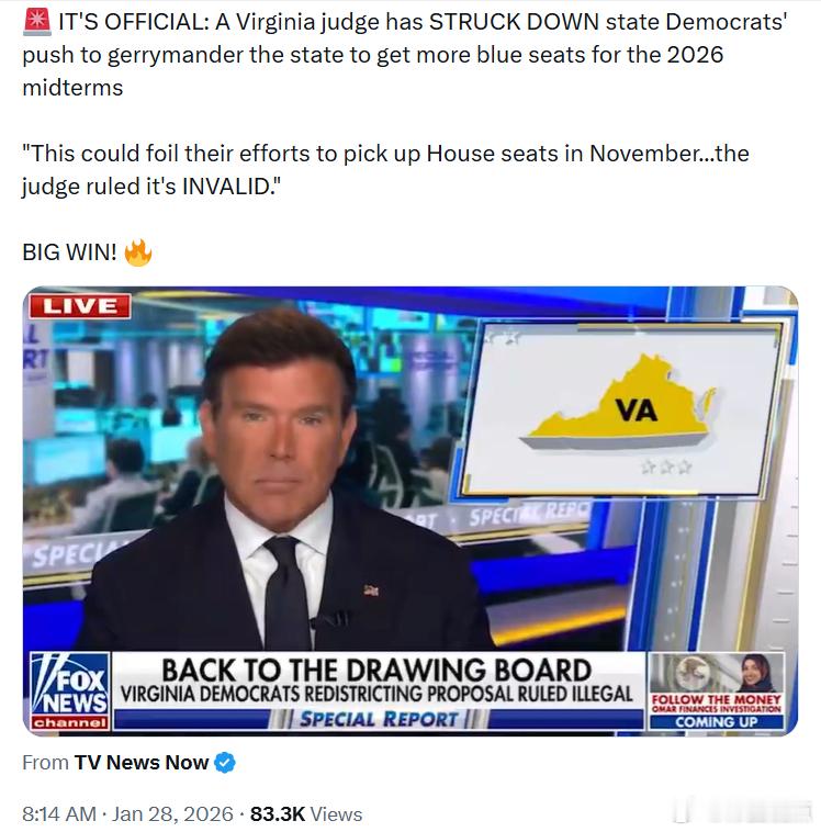 弗吉尼亚一位法官已驳回州内民左党试图重新划分选区以在2026年中期选举中争取更多蓝色席位的行动。