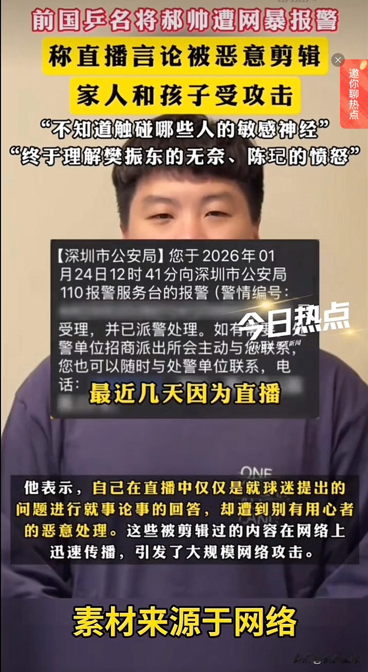国乒名将郝帅遭遇“网暴威胁”:果断报警! 近日退出国乒的名将郝帅,因为直播片段被人恶意剪辑,遭到网络暴力,郝帅第一时间果断报警。 郝帅是张继科同时代运动员,目前虽然退出国乒,但仍然还在打球。 现在的网络环境,确实鱼龙混杂,各种“恶意”层出不穷,稍不注意,就会被莫名背锅。 支持郝帅👍