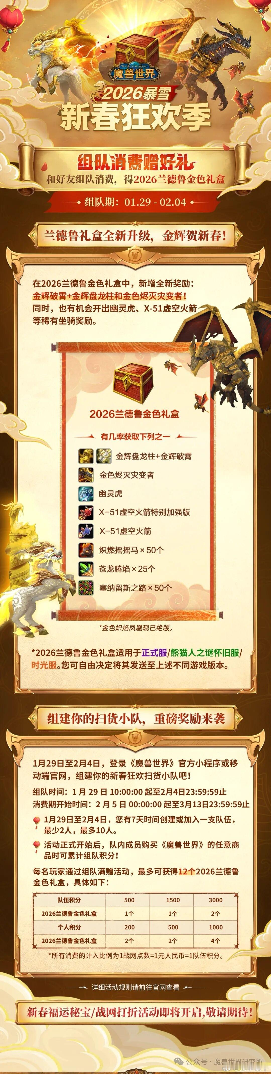 重磅!国服新春活动来了!正式服史上功能最强的飞行坐骑加入奖池!而本次新春活动最重磅的亮点,正是这只金色烬灭灾变者坐骑!它与此前泰坦重铸时光服专属的 “烬灭灾变者” 外观相似,原本由于功能过于强悍被认为是时光服限定,如今不仅时光服实装,连正式服也同步上线了,虽然官方没说它的功能是否和烬灭灾变者一样,但是从图片展示看,金色烬灭灾变者同样附带这两只小龙,功能大概率与原版一致。如果功能一致,那么这只坐骑将成为魔兽正式服首个带实用功能的飞行坐骑!原版烬灭灾变者会伴随两只迷你小龙(安贝莉娅 + 斯帕克昂):左侧的安贝莉娅是移动邮箱,能随时收发邮件;右侧的斯帕克昂提供修理服务 + 基础材料购买。魔兽世界魔兽世界
