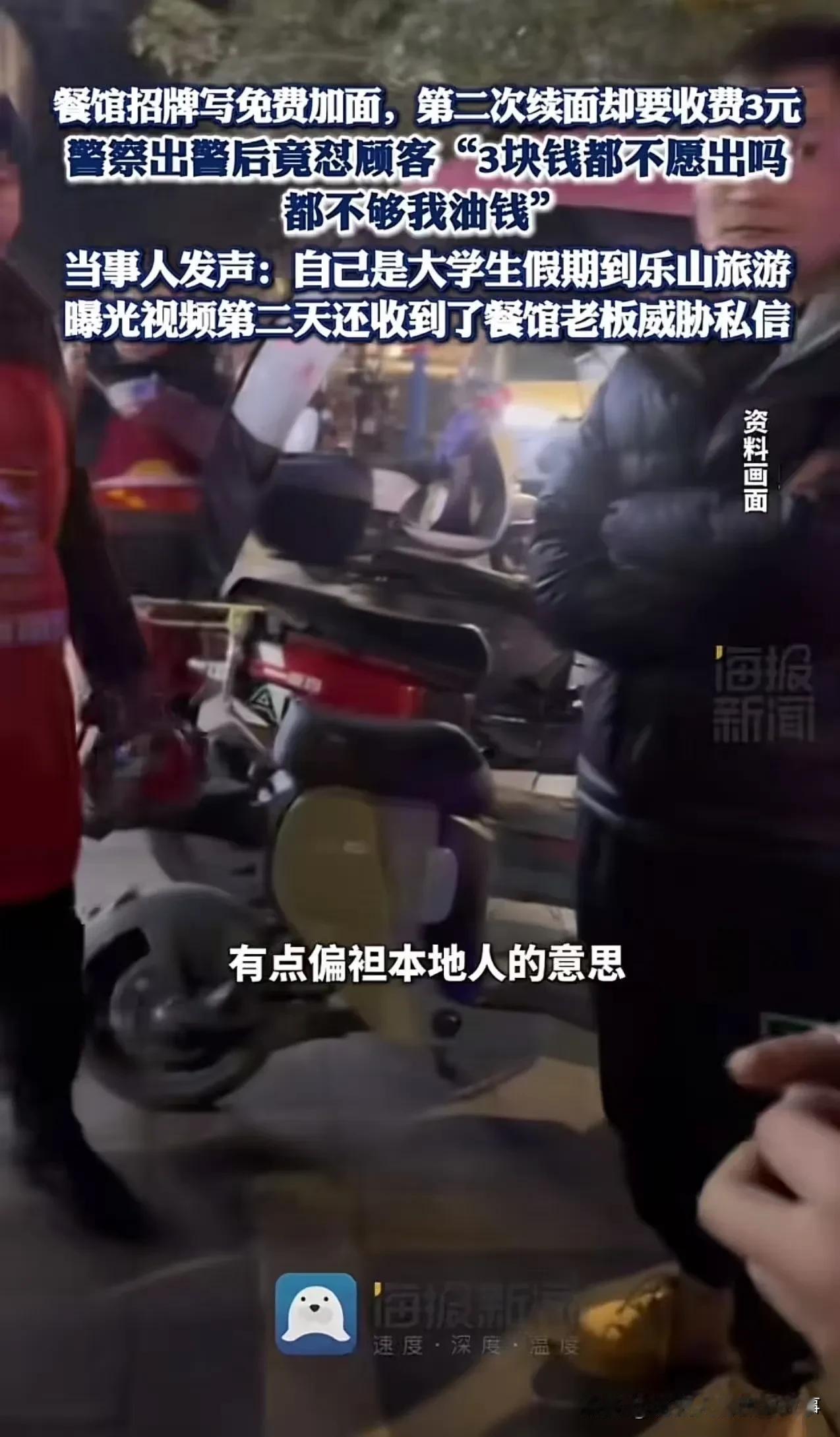 这件事核心争议在招牌“免费加面”是否无附加条件,民警表态欠妥,两边都有可商榷处。 面馆标了免费加面却二次收费,属于口头/明示承诺不符,是理亏的一方;大学生较真维权没问题,但也可先和老板沟通是否有“限1次”等未标注规则。 民警的回应太情绪化,既没厘清消费纠纷核心,还拿出警成本说事,偏离调解本职,容易激化矛盾。 说到底,面馆该明确加面规则(比如限1次免费),消费承诺要兑现;维权要理性沟通,执法更要中立讲理,3块钱事小,规则和态度事大。一碗面纠纷 餐饮收费争议 素材来源于,侵权删除