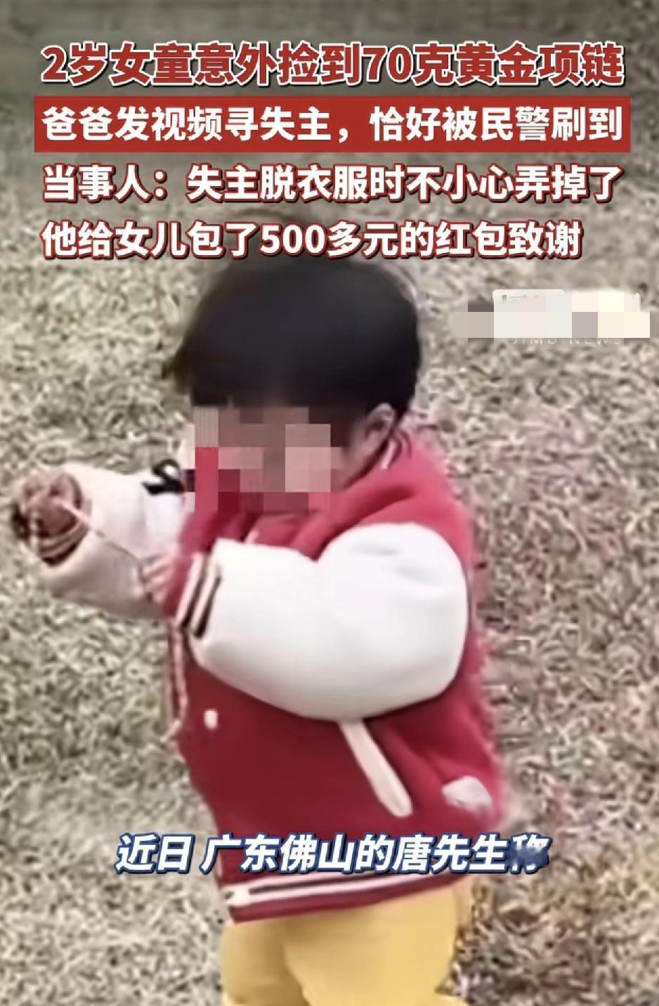 广东佛山一位网友发视频称自己带着两岁的女儿到草地上玩,女儿不经意间捡到了一条重达70克的黄金项链于是网友发视频寻找失主。原来失主跟网友是同一个镇上的,刚好那天也是带着孩子出来玩,自己脱衣服不小心掉下来的。为了表示感谢,失主给这位网友的女儿包了500块钱的红包。很多网友说,面对70克的黄金项链,很多人是抵不住诱惑的。