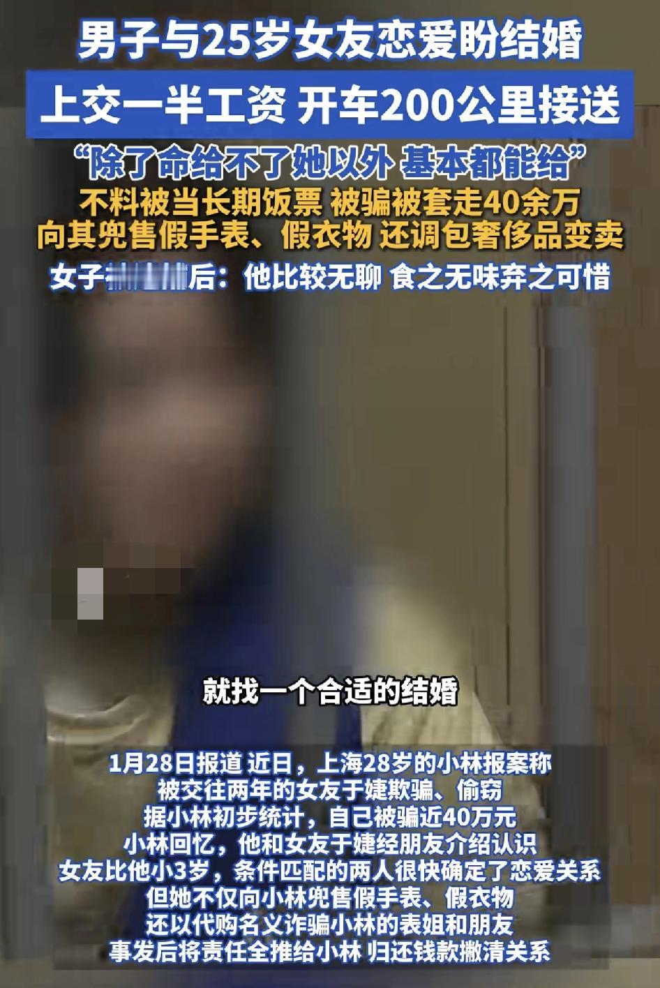 上海一名28岁的小伙子经朋友介绍认识了比他小三岁的女友。两个人的条件匹配,很快就确认了恋爱的关系,但没有想到在恋爱期间,女友多次掀起手。出售假手表,假包包等等,还以代购的名义骗取男友的亲戚。男友表示恋爱期间,除了命没有给女朋友之外,什么都可以给他,工资上交一半,还驱车200公里接送。发现自己被骗以后,女友却辩称觉得对方是太无聊了,食之无味,弃之可惜的感觉。