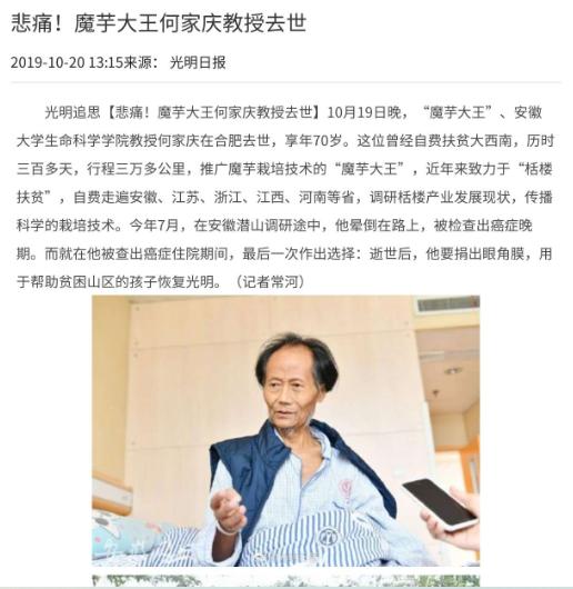 1998年,安徽大学教授何家庆来到深山调研。由于过于饥饿,于是就向村民讨吃的。不料,村民居然端来一碗猪食,没想到何家庆不仅没生气,甚至接过那碗猪食,泪流满面地吃了起来。 “老乡,能不能给口吃的?” “家里也没啥好东西,你别嫌弃。” 1998年夏天,安徽大学五十出头的教授何家庆,风风火火跑进深山调研,他饿得眼发花,停在这个小村头,跟村民要口饭吃。 村民端上一碗热气腾腾的糊糊,颜色灰不溜秋,粘里带稠,说是家里平常的饭,何家庆没多想,端起来就咬了一大口,他一边嚼,一边泪水在脸上打转,那一刻,他心里彻底乱了。 村民站在一旁看着,一句话没说,何家庆能感受到,这不是糊弄人,这碗饭,就是村里人一天的主食,红薯渣和野菜混成一团,没油没盐,谈不上味道。 何家庆咬着嘴里的糊糊,喉咙发紧,整个人像被棍子敲了一下,他清楚,自己本来可以坐在教室里,写材料,讲课,喝茶,按部就班过日子,可这碗饭让他坐不住了。 吃完饭,他把碗放下,问村民平时都靠什么过日子,村民叹了口气,说地里种不出啥好东西,红薯和野菜能混口饭吃就不错了。 何家庆心里堵得慌,没再多问,第二天一大早,他又去村里转了一圈,看见家家户户都差不多,屋里没什么家具,灶台边上摆着同样的糊糊,何家庆心里想着,这日子什么时候是个头。 他回到学校,心里一直静不下来,晚上睡不着,脑子里老是转着那碗糊糊的味道,有人劝他,农村穷不是一天两天的事,咱们做学问的,能做多少是多少。 可何家庆心里过不去,他觉得,自己要是不下场,光靠写报告,农民的饭碗永远是红薯渣子。 他琢磨了一个星期,把家里积攒多年的钱都拿了出来,二万多块钱,买了种子,带了工具,装好背包,就往山里走,他把家里人叫到一起,说自己要走一趟远路,这一走,可能很久都不回来。 家里人不太理解,觉得他年纪大了还折腾啥,何家庆没解释太多,只说:“我得去。” 他进山后,什么都得靠自己,白天走村串户,晚上就借住在村民家里,住得多了,村民们才信任他,慢慢愿意跟他聊聊家里的事。 何家庆每天都问,地里能种什么,谁家有啥难处,家里的孩子有没有机会读书,他走到哪里,背包就背到哪里,背包里装着各种工具和种子,也有家里人给他带的咸菜,他舍不得吃,每天都省着点。 有时候走一天路,只能啃几口干馍。睡觉的时候,身下是木板或者泥地,到了雨天,鞋子湿了干,干了湿,有人看他像乞丐,有人觉得他是骗子,甚至有一次被村干部误会了,把他带到村委会盘问。 何家庆不生气,只解释自己是大学老师,专门来帮大家想办法的,时间长了,村干部才相信他。 有一回,他在村里碰上一个老大爷,老大爷家里只有一个儿子,常年在外打工,家里全靠老两口种地,何家庆跟着老大爷下地,发现地里全是红薯和野草。 老大爷说,这土地瘦,啥都种不出来,何家庆蹲在地头,仔细看了土壤,心里有了主意,他回城里找了资料,想着能不能试试别的作物。 他琢磨了很久,决定带着魔芋的种子进山,魔芋这种东西,能在贫瘠的土地里长得好,过去没人敢种,怕卖不出去。 何家庆不信这个邪,他自己带头试种,亲自种在村里的地头,村民们起初不信,觉得他是瞎折腾,结果一年下来,魔芋长得不错,卖出去还能赚点钱,村民们眼睛亮了,跟着他学种魔芋。 他一遍遍地教大家怎么选地、怎么种、什么时候浇水,耐心得像哄孩子,村民们慢慢学会了,日子也开始有了点起色,何家庆从不收大家一分钱,谁家缺啥就帮着谁,他就这样在山里一待就是好几年,走遍了很多村子。 有人觉得他傻,说他一个教授,跑来山里赔本,何家庆不在乎,觉得只要农民能吃饱饭,自己吃点苦算啥,有时候,他夜里躺在床上,想起合肥的家,心里会有点难受,可第二天一早,看到村里的孩子能吃上一口热饭,他就觉得值。 期间,他家里也出了事,父亲去世的时候,他正在外地调研,没能见上最后一面,女儿出车祸,他也只能打电话安慰,每次想到这些,何家庆心里都堵得慌,可他明白,自己选择了这条路,就得一直走下去。 后来,魔芋的种植慢慢铺开了,村民的日子一天比一天好,何家庆心里也踏实了些,他本可以就此收手,回家安度晚年,可他没停下,又琢磨起别的作物。 退休后,他又扎进田里,研究栝楼的种植,还是跟当年一样,白天在地头,晚上记笔记。 2019年那年夏天,何家庆在田间晕倒,被送进医院,查出来是癌症晚期,家里人急了,让他安心养病,何家庆却还想着田里的事,叮嘱学生把实验做完,病房里,他静静地躺着,心里只有一个念头:能多帮一个算一个。 他最后的愿望,是把自己的眼角膜捐出来,他希望,哪怕自己走了,也能帮到别人,2019年秋天,他安静地离开了,村里人听说后,都自发赶来送他,没有什么隆重的仪式,大家站在田埂边,默默地送他最后一程。