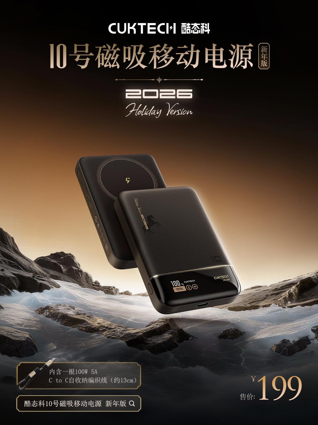 CUKTECH酷态科 马年新春大礼包来了,囊括了10号Air、10号磁吸、6号卡片、10号充电器Mini和10号充电器Ultra,全系黑金配色(确定不是黑神话联名版?),非常酷。我对比了下价格,与首发价格相比基本都没加价,甚至还更便宜了。大伙儿之前如果有想买的,这次完全可以买新春版,哪怕买一套收藏也是非常nice的。