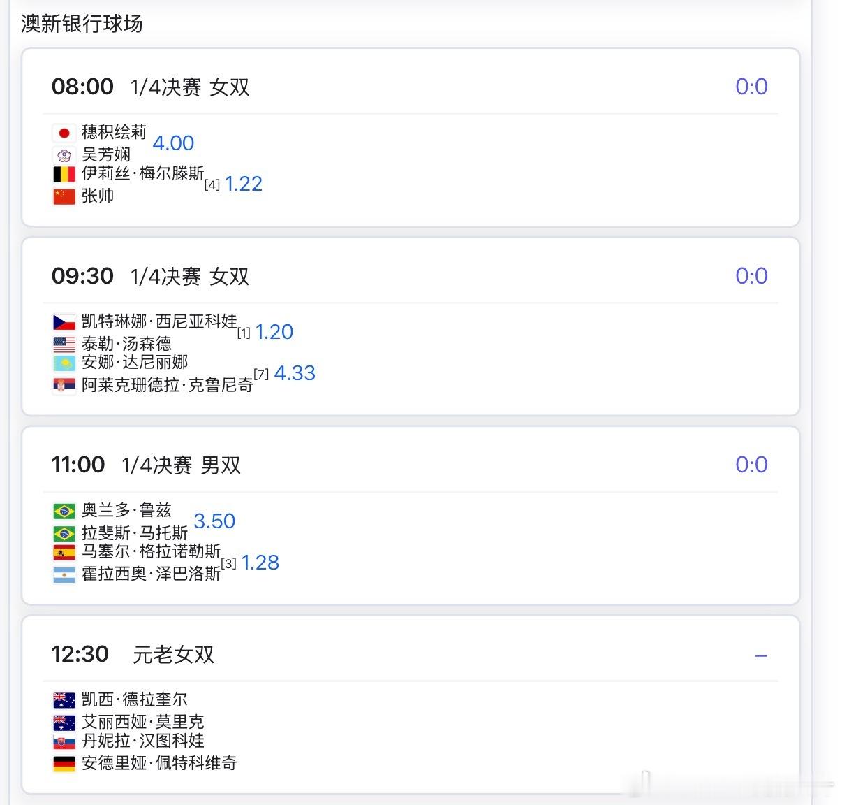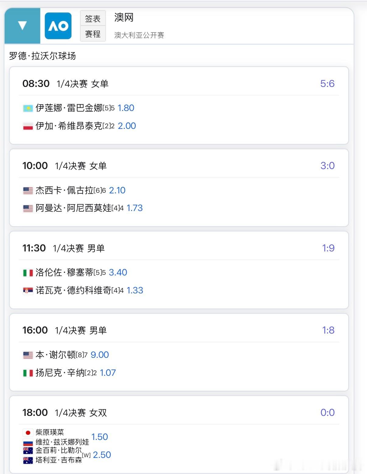 🔵澳网2026 1月28日焦点赛程07:00 🇨🇳张瑞恩青少年女单08:00 🇨🇳张帅/🇧🇪梅尔滕斯vs🇯🇵穗积绘莉/吴芳娴08:30 🇰🇿莱巴金娜vs🇵🇱斯瓦泰克 🔥09:30 🇨🇳渠依含青少年女单10:00 🇺🇸佩古拉vs🇺🇸阿尼西莫娃11:30 🇷🇸德约科维奇vs🇮🇹穆塞蒂16:00 🇮🇹辛纳vs🇺🇸谢尔顿