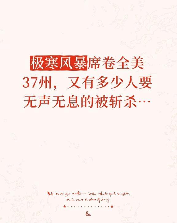 川子你要的格陵兰,亲自上门来找你了 23号开始的风暴。南方冻雨,北方速冻,多地气温骤降到一45℃,37个州进入紧急状态,覆盖2.13亿人,大面积断电外加交通瘫痪,天然气📈五天翻了一翻。而且一波未平下一波北极寒流紧跟着就来了,估计起码得持续到2月初。重点是现在红蓝僵局悬而未决,“嘎伐门特”停摆概率飙到了80%,而这个尴尬的时刻恰好赶上冬季风暴灾后重建窗口期,搞得不好要雪上加霜[扶额R]。 热点 雪花飘飘北风啸啸 斩杀线
