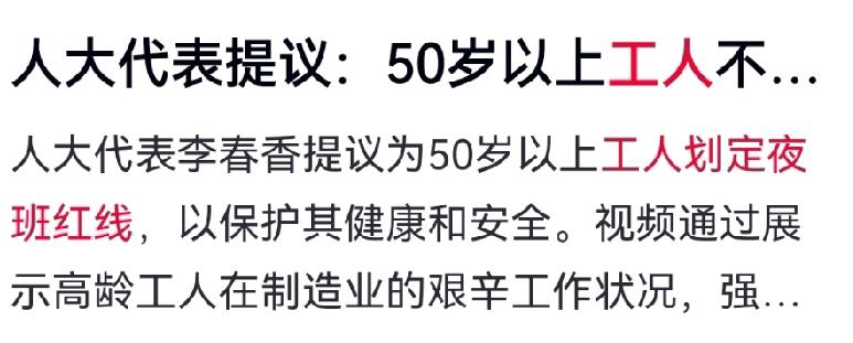 给高龄工人夜班划“红线”,这道关早该把牢了! 广东两会上一则建议引发关注:省人大代表李春香呼吁为高龄工人设立夜班“红线”。 制造业流水线上,不少50岁以上的工人仍在通宵奋战。身体扛不住,却因岗位少、选择难,往往不敢说不。 医学研究明确,50岁后熬夜伤病风险大增,制造业夜班工伤中,高龄工人占比尤为突出。 然而,一些企业通过劳务外包等方式规避责任,调岗机制缺失。李代表建议:明确夜班年龄门槛与健康评估,夜班需本人书面同意、通过健康筛查,高危岗位夜班则应直接禁止。同时建立调岗协商机制,由工会权益专员跟踪落实。 高龄工人不是负担,守护他们的健康,就是守护生产力与尊严。劳动者的健康权,不该随着年龄被打折。期待建议早日落地,让那些默默扛下夜晚的人,也能安心走在光里。 对此你怎么看? 夜班 夜班打工 工厂上夜班