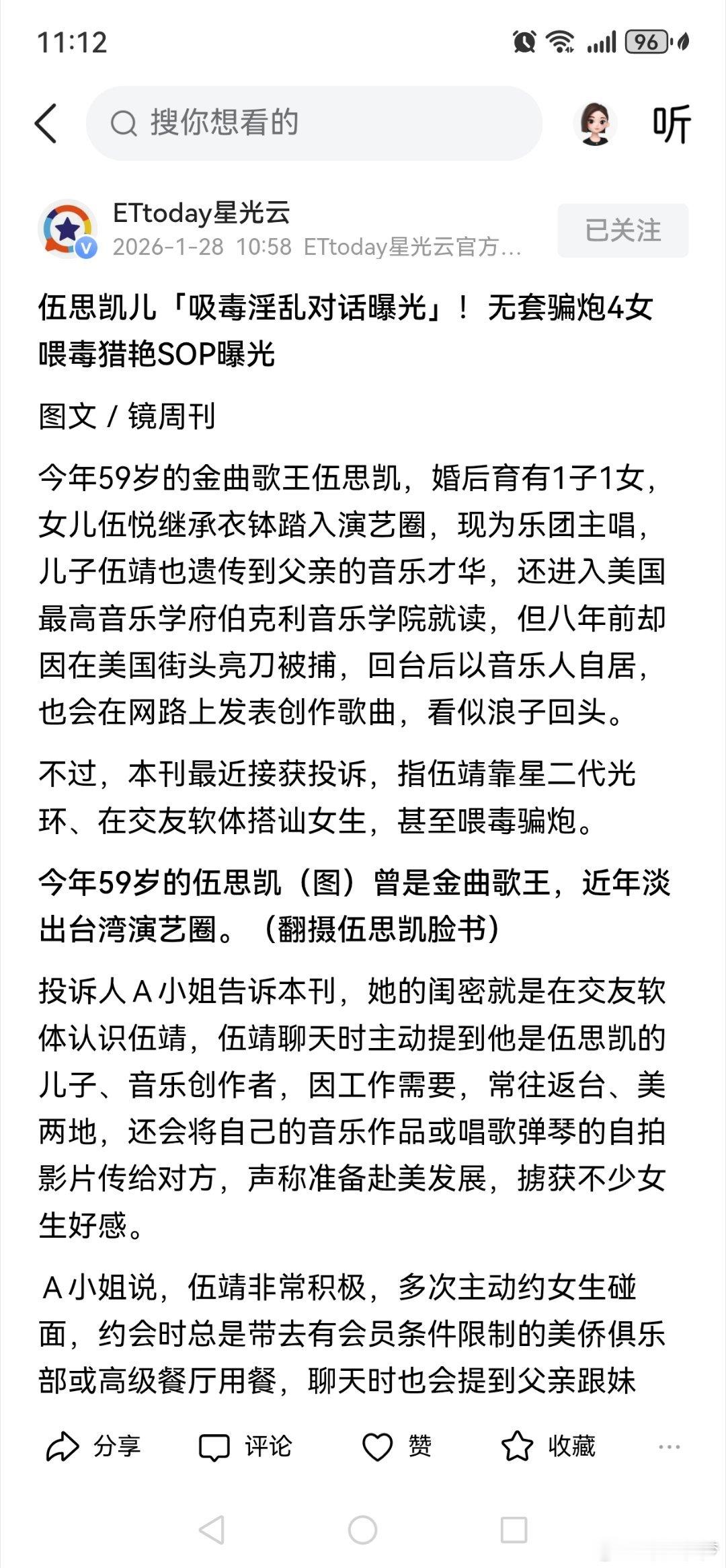 台媒曝伍思凯儿子吸毒台媒曝伍思凯儿子骗炮4女喂毒 伍思凯儿「吸毒淫乱对话曝光」!无套骗炮4女 喂毒猎艳SOP曝光台媒镜周刊报道今年59岁的金曲歌王伍思凯,婚后育有1子1女,女儿伍悦继承衣钵踏入演艺圈,现为乐团主唱,儿子伍靖也遗传到父亲的音乐才华,还进入美国最高音乐学府伯克利音乐学院就读,但八年前却因在美国街头亮刀被捕,回台后以音乐人自居,也会在网路上发表创作歌曲,看似浪子回头。不过,本刊最近接获投诉,指伍靖靠星二代光环、在交友软体搭讪女生,甚至喂毒骗炮。今年59岁的伍思凯(图)曾是金曲歌王,近年淡出台湾演艺圈。(翻摄伍思凯脸书)投诉人A小姐告诉本刊,她的闺密就是在交友软体认识伍靖,伍靖聊天时主动提到他是伍思凯的儿子、音乐创作者,因工作需要,常往返台、美两地,还会将自己的音乐作品或唱歌弹琴的自拍影片传给对方,声称准备赴美发展,掳获不少女生好感。A小姐说,伍靖非常积极,多次主动约女生碰面,约会时总是带去有会员条件限制的美侨俱乐部或高级餐厅用餐,聊天时也会提到父亲跟妹妹,分享明星家庭的生活,让女生感觉他是出手阔绰又平易近人的星二代,加上嘴巴很甜,总是喊女生「宝贝」或是「老婆」,所以猎艳无往不利,不少女生第一次跟他约会就晕船,被他带回住处或摩铁发生关系。未婚成年男女约炮上床,外人无可置喙,不过,伍靖为了猎艳,竟然还分享自己吸大麻的经验,甚至以免费提供大麻当诱因,把女生约到住处上床,让A小姐看不下去,决定公开他的恶行。
