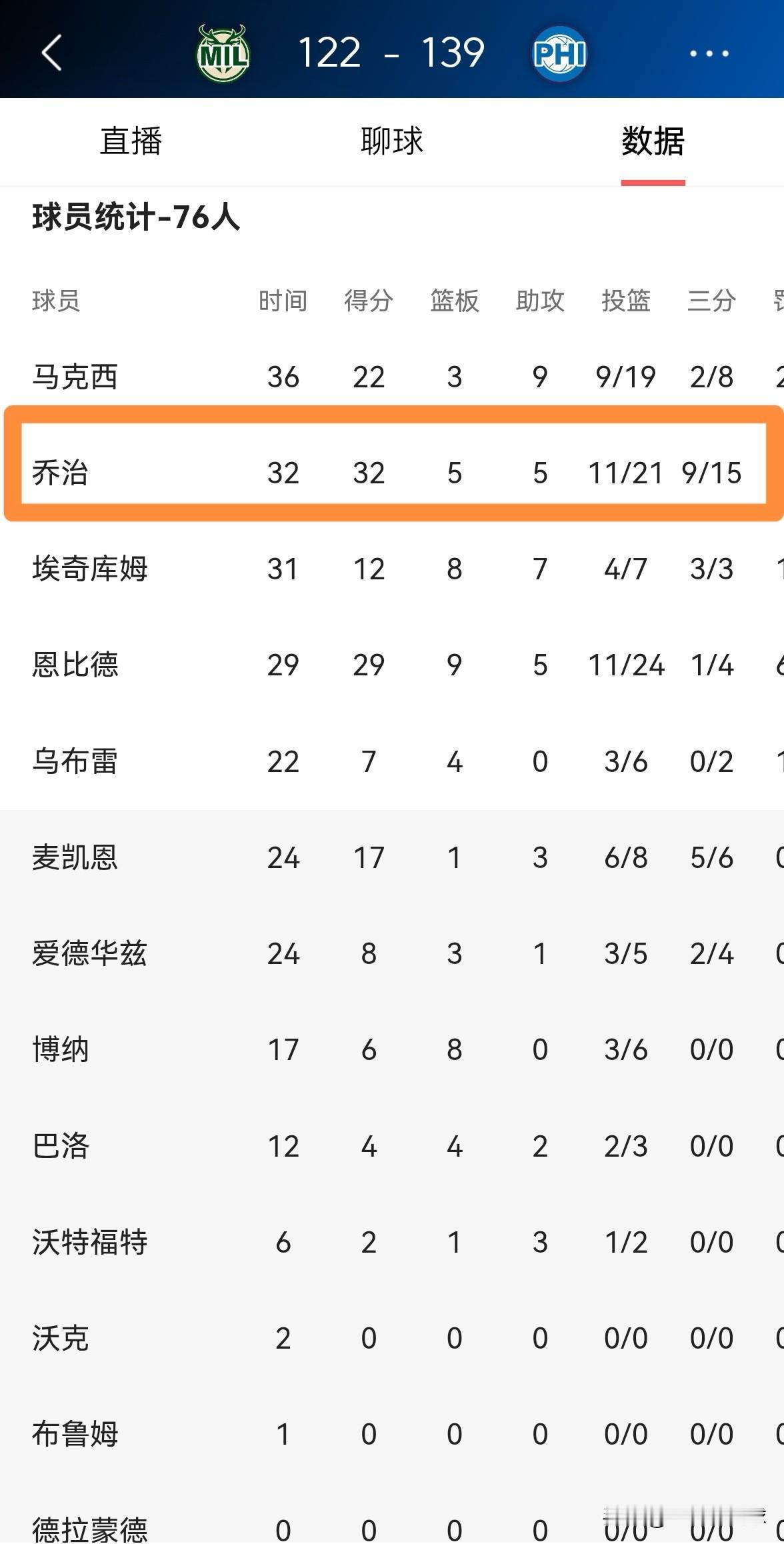 76人巨星保罗-乔治真是彻底的爆发了!在今天76人主场以139:122大胜雄鹿的比赛中,乔治打出了极其出色的表现,尤其是在三分球方面,乔治简直是如有神助。 全场比赛下来,乔治首发出战32分钟,投篮21中11,其中三分球15中9、罚球2中1爆砍32分,还有5篮板5助攻2抢断,他的场上正负值为+13。 坦白说,以乔治在本场比赛中的表现来看,他绝对是球队获胜的最大功臣,他在攻防两端都打出了超级巨星的表现。
