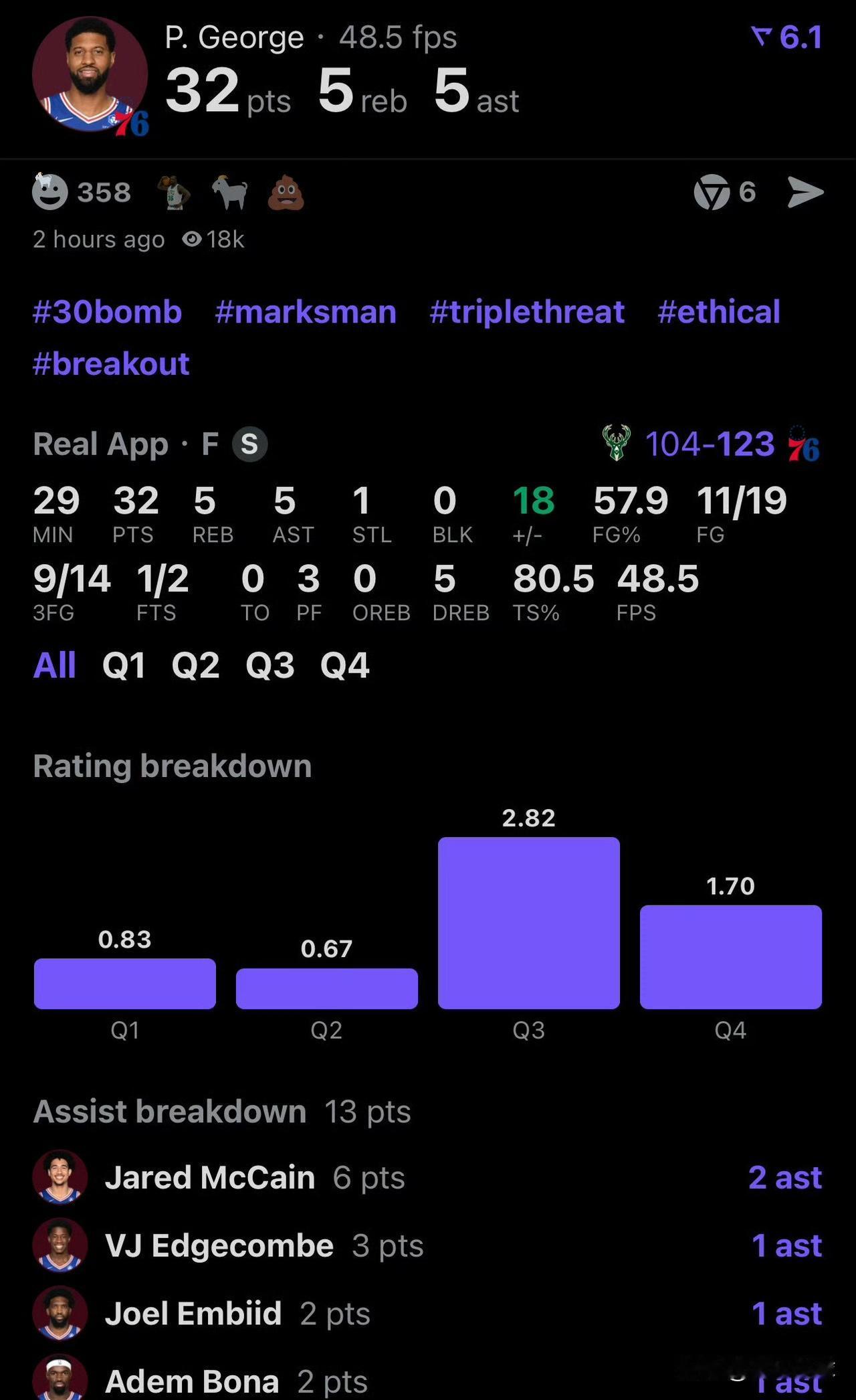 乔治梦回巅峰啊! 今天,76人队坐镇主场迎战雄鹿队,本场比赛乔治迎来复出,他的表现非常出色,全场比赛还未结束,他就已经得到了32分5篮板5助攻1抢断,命中了9记三分球,真是梦回巅峰时期。每当雄鹿队发起反扑的时候,乔治都能用一记记精准的三分球完成压制,帮助球队稳住了局面。这应该是乔治加盟76人队以来的最佳一战,健康的他依旧是攻防两端的大杀器!