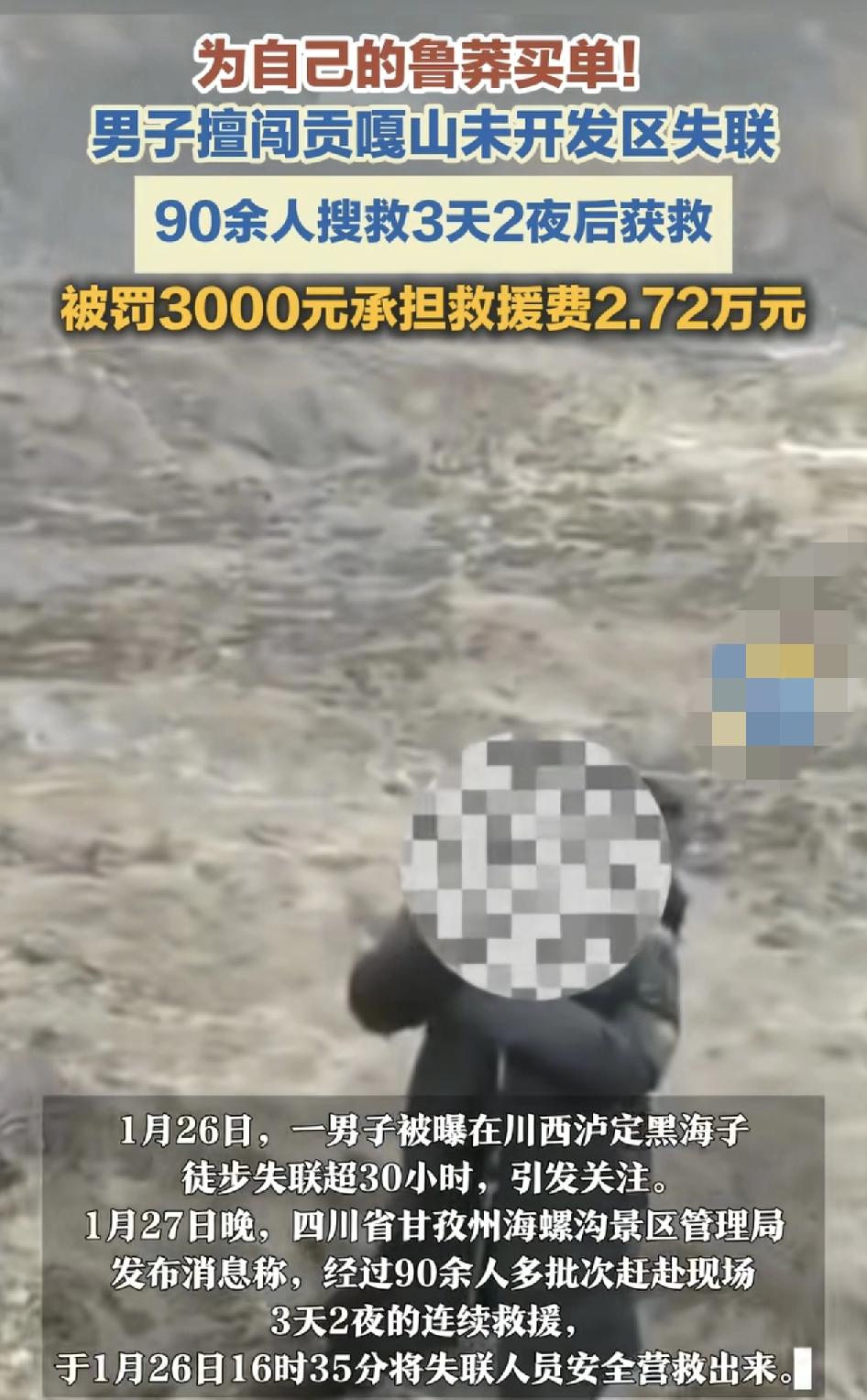 川西泸定黑海子一男子独自闯入未开发区域徒步失联近30个小时。90余人的救援队多次赶赴现场。经过三天两夜的搜救,终于找到男子,期间男子靠吃雪、吃花、吃树叶求生。男子擅闯未开发区域的行为违反了相关的规定,有关部门对男子进行3000元的罚款,以及缴纳2.72万元的救援费用。网友表示,这样的处罚制度有效阻止更多想非法闯入未开发区域的人群。