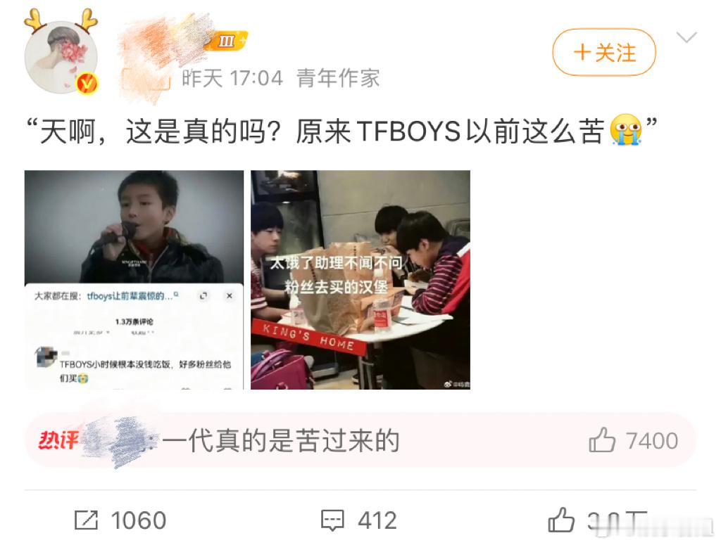 曝TFBOYS小时候没钱吃饭曝TFBOYS在练习生时期手上没什么零花钱,又是长身体的时候,所以粉丝给TFBOYS买汉堡🍔 2025微博之夜爆款创作大赛