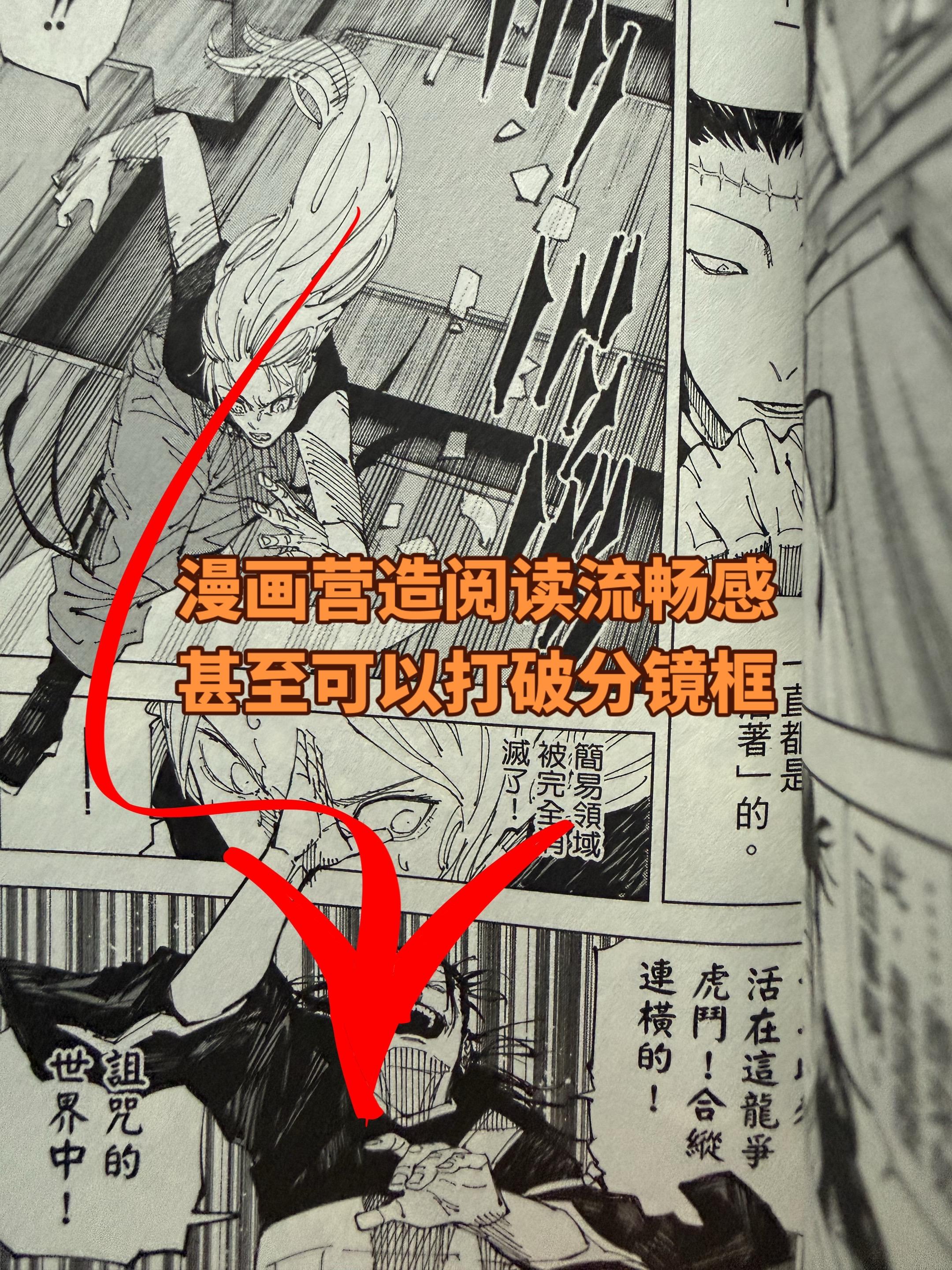 《咒术回战》漫画中常见分镜方式。这种分镜的方式在续篇中也有不少吧。把一整页漫画作为一幅画进行构图,制造视觉引导,甚至可以打破分镜框漫画漫画家绘画笔记
