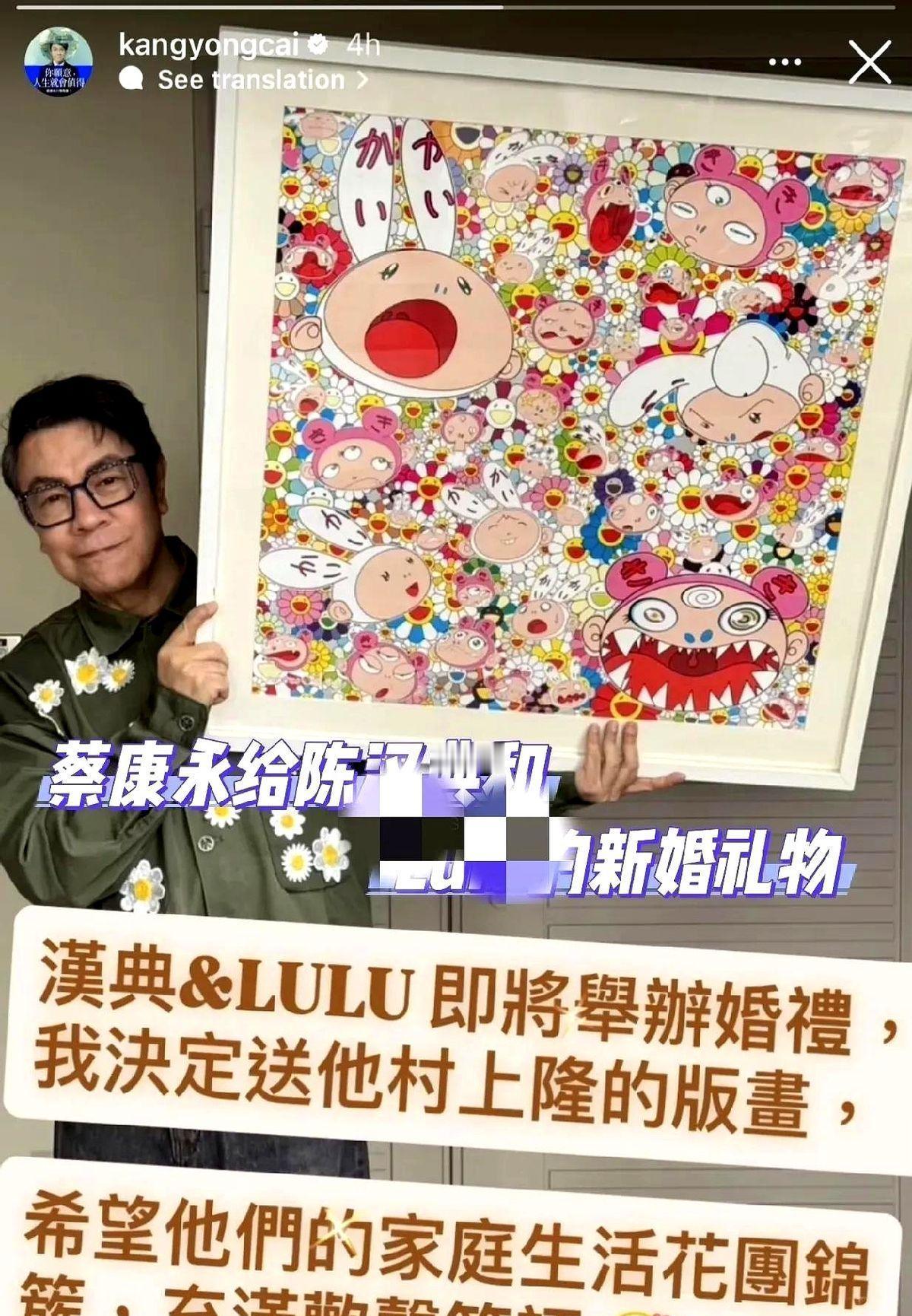 你以为蔡康永送陈汉典婚礼的版画值5000?错,真实价格,是20万。 这背后的人情世故,比钱可怕。 普通人随份子,高手送资产。 一个红包,人情消费完就清零了。 一幅村上隆,挂在新房里,天天都在帮你“刷存在感”,还会增值。 更狠的是,这份礼物发射了一个信号:“我懂你的审美,也预祝你的未来花团锦簇”。 这种“被读懂”的感觉,是拿钱砸不出来的精神奢侈。 看懂了吗? 蔡康永经营的不是一次性的关系,而是持续的情感账户。 他用挑选的时间,替换了支付的瞬间,把一次社交行为,变成了长线投资。 所以记住,人际关系的顶级段位,拼的从来不是红包的厚度,而是你为对方思考的深度。