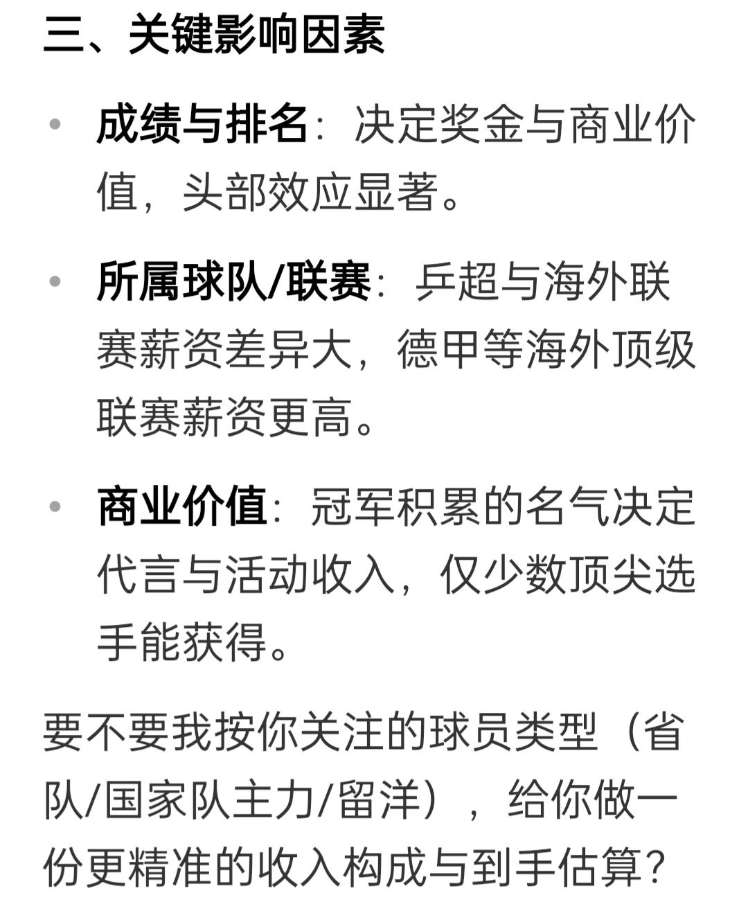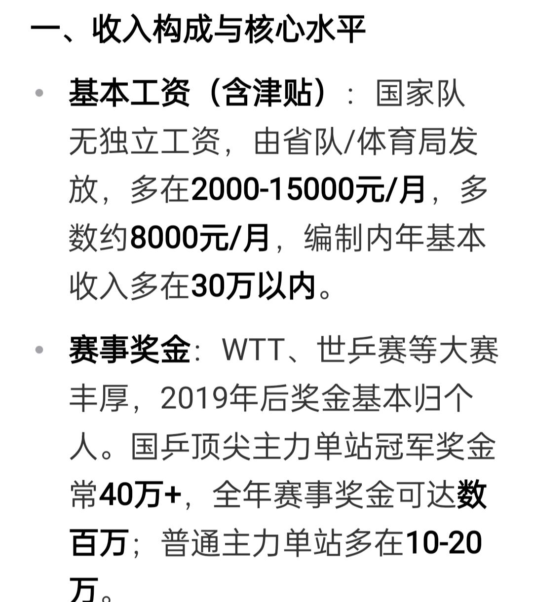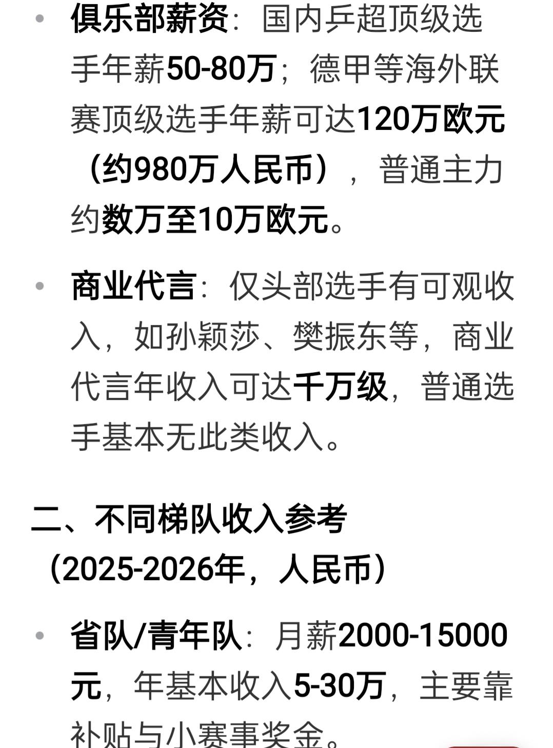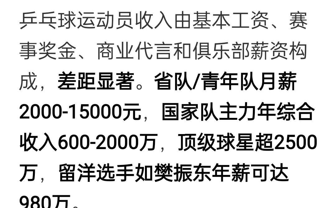 有人说中国乒乓球队由国家养着,其乒协是事业单位等等!还说别人不知,可笑至极! 纠究谁可笑呢! 乒协是民间社会团体,乒协主席无极别!有升国旗,奏国歌的国际正赛,中国乒乓球协会是唯一可代表中国参赛的队伍! 送入国家队的运动员,没有独立的工资,所有国家队运动员的薪资由省市队发放,加上参加所有赛事的奖金,名声大的有代言费!顶级球员代言费就高,留洋的球员有各俱乐部薪资加代言费! 省队,青年队参加的赛事级别低,几乎没有代言,月薪2千一1万五左右,国家队主力年薪6百一2千万,顶级球星年薪可2千5百万元人民币左右,留洋选手如樊振东年新可达900万左右欧元!!! 这就是所有运动员头削尖,要挤身国家队,选入国家队还要拼老命地要乒球塔尖挤的原因! 中国乒协平时就是普普通通的中国乒乓球协会,只有在参加升国旗奏国歌的正赛时,才代表国家队!参加WTT时代表中国乓协,是为自个儿争名争利,好为以后的代言开路!!!