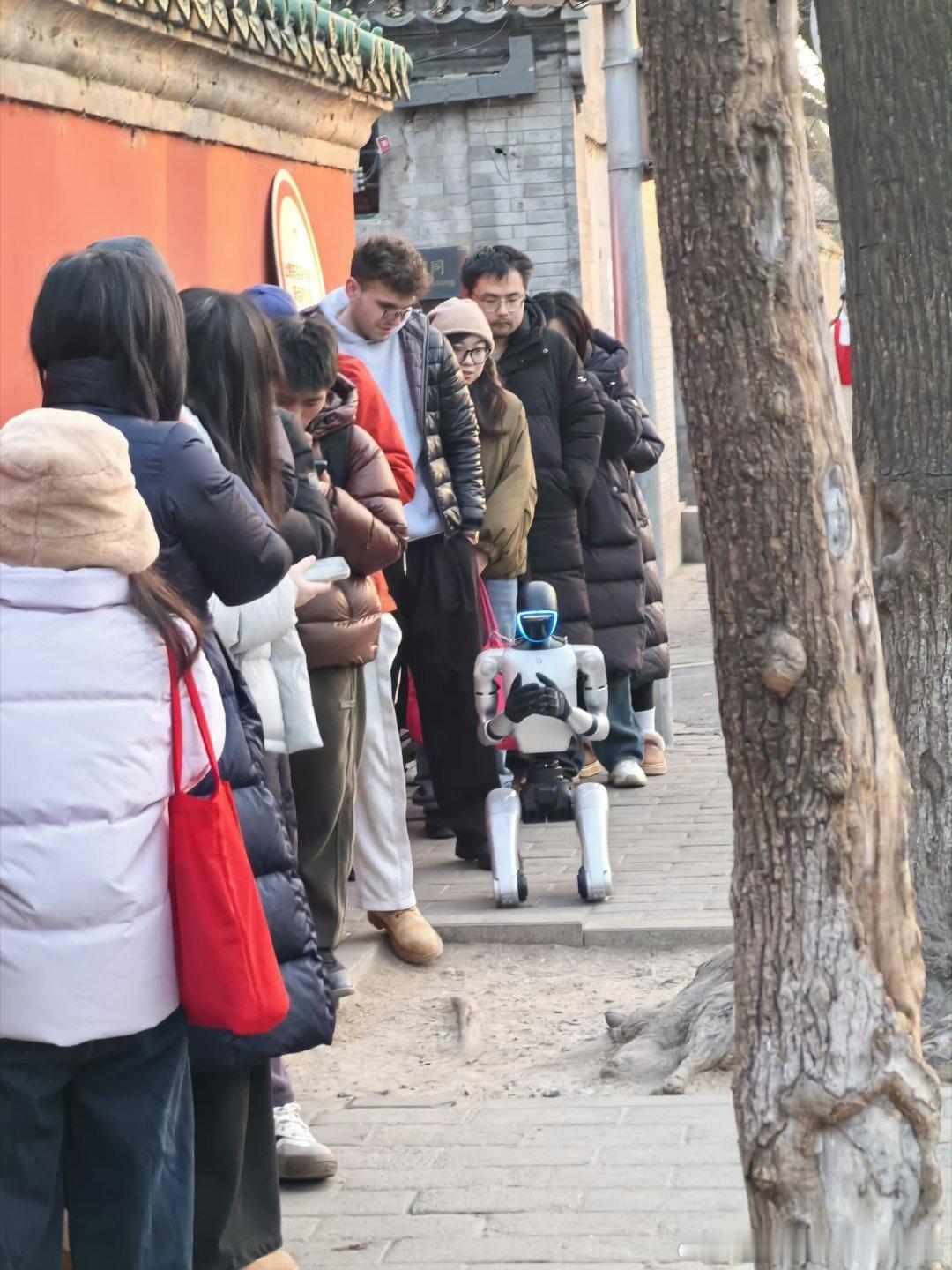 第一个活人化机器人出现了动作标准神情专注,端粥递福一条龙,游客疯狂贴贴拍照。赛博