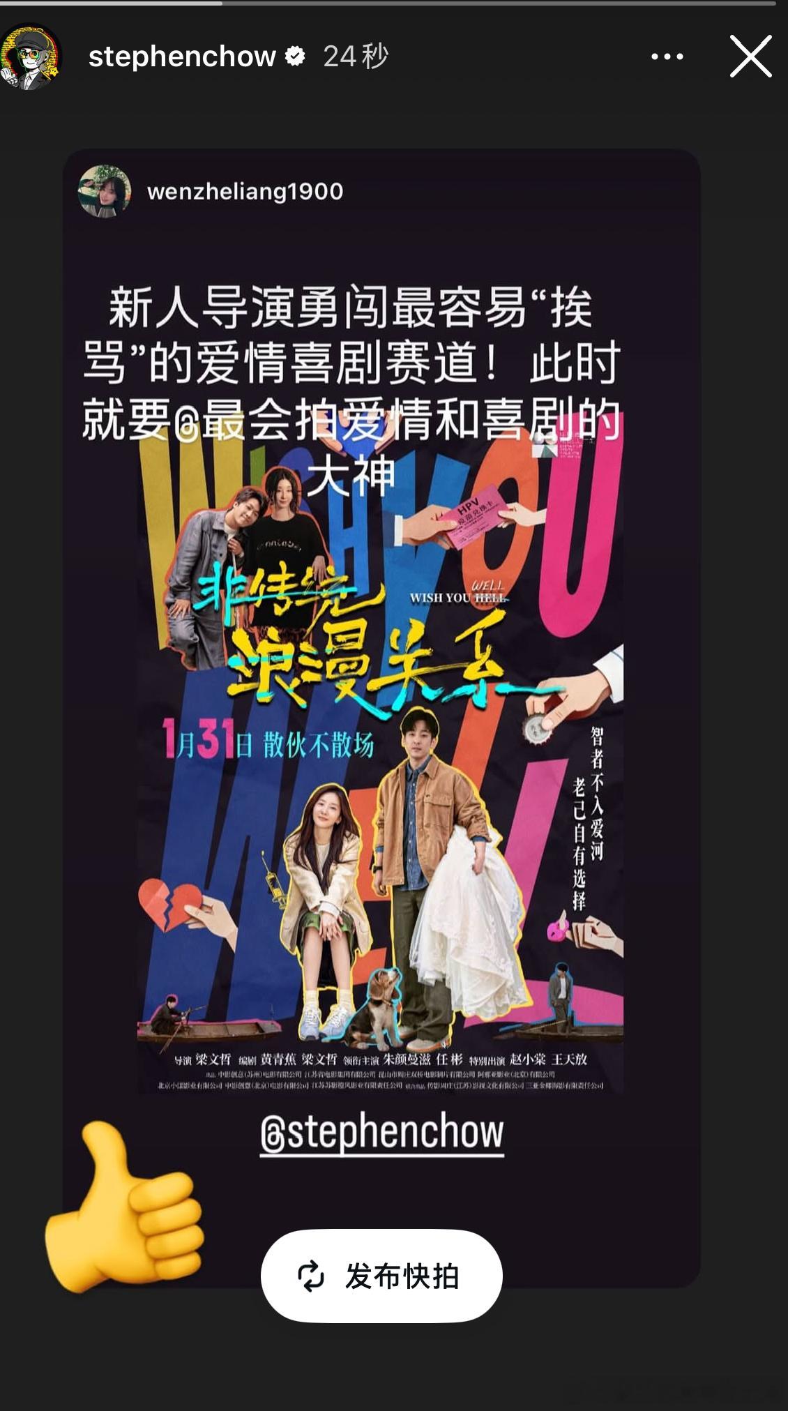 被星爷翻牌的爱情喜剧 星爷亲自点赞认证!新人导演的这部爱情喜剧到底藏着什么惊喜?离婚夫妻反向牵线,拉扯感直接拉满,海王海后在线过招,套路互撩笑料百出,还有朱颜曼滋×任彬、赵小棠×王天放双组对决,金广发、王勉喜剧人天团加盟buff叠满!能让最懂爱与喜剧的星爷翻牌,这波绝对是宝藏好片!预告片全程高能,情感话题犀利开麦,金句戳心又好笑,笑点与共鸣双在线!各就位票已备好,坐等影院沉浸式大笑!😃电影非传统浪漫关系跨年电影愿