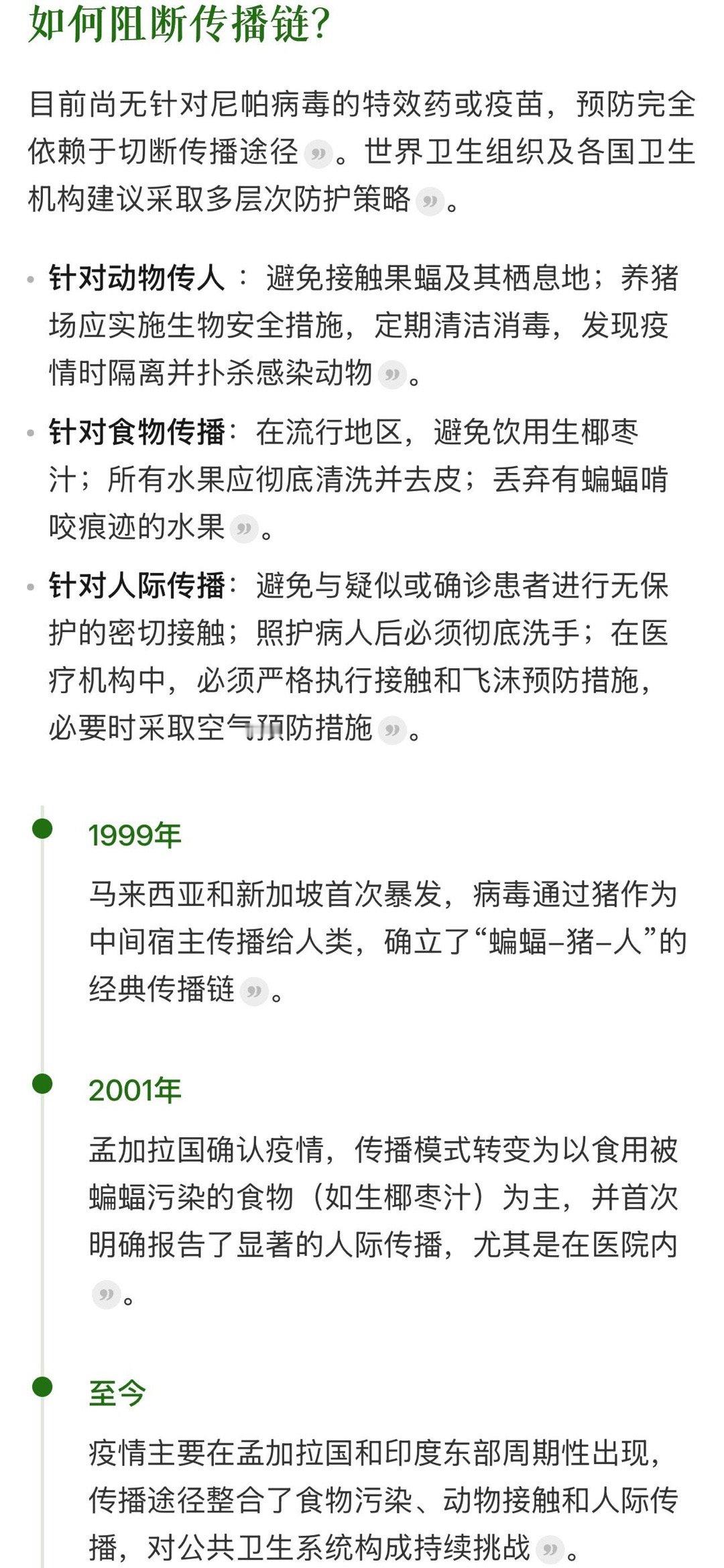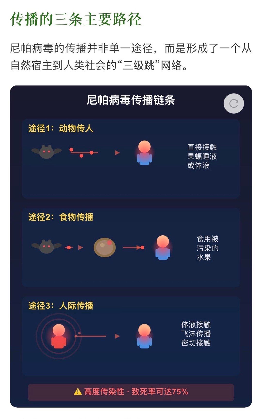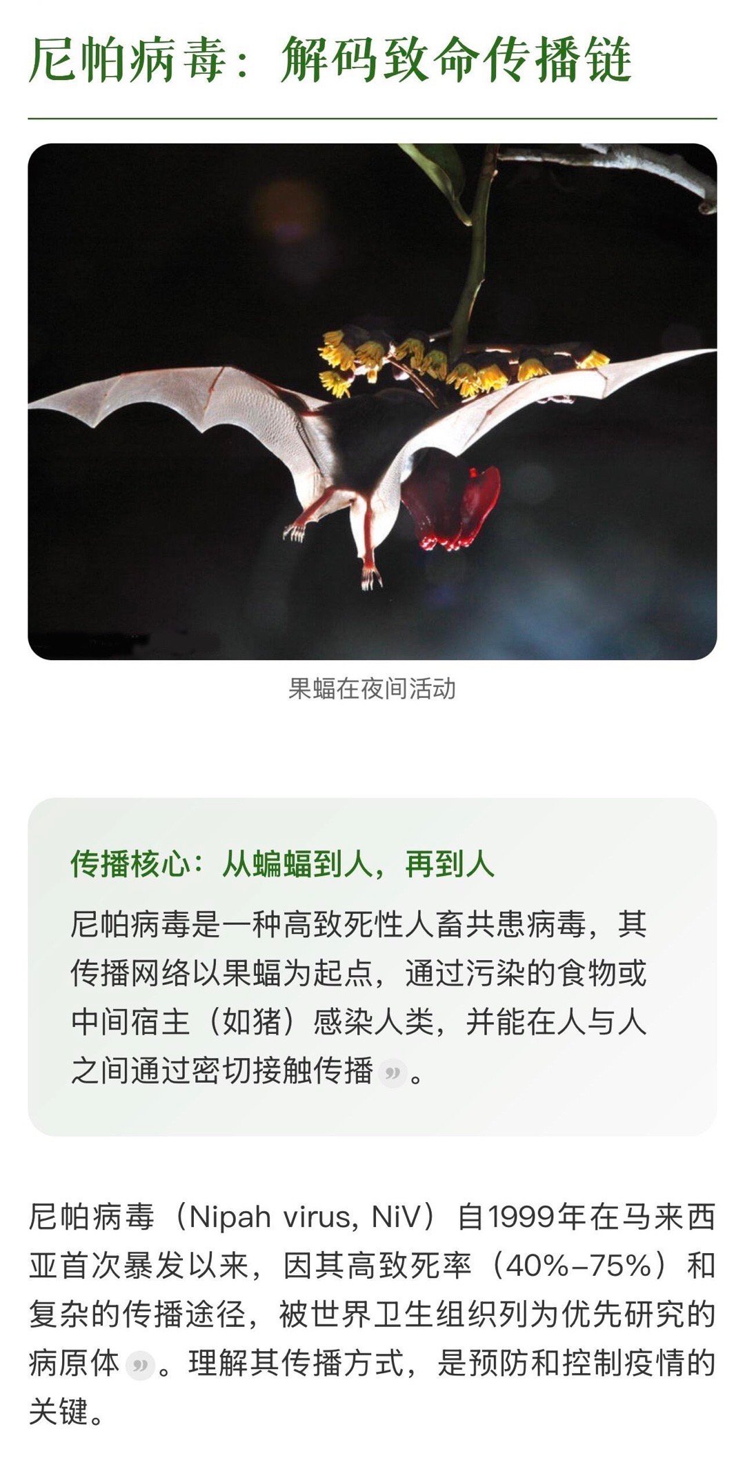泰国果蝠体内发现强毒性尼帕病毒很多人听到尼帕病毒后的第一反应是: “这离我应该很远吧?” 从目前情况来看,这个判断并不算错。 尼帕病毒的主要传播链,并不是日常社交。 它更多和特定地区、特定动物接触、特定饮食习惯有关。 对普通城市居民来说,日常生活中直接感染的概率极低。 但这并不意味着可以完全忽视。 因为公共卫生的风险,从来不是“现在有没有”,而是“未来会不会”。 病毒跨物种传播,本身就充满不确定性。 我们真正需要做的,其实不是焦虑,而是保持基本认知: ✅ 不迷信偏方 ✅ 不传播未经证实的消息 ✅ 不被情绪化内容牵着走 安全感,很多时候不是来自“什么都不会发生”, 而是来自“即使发生了,我也知道该怎么判断”。 尹烨谈尼帕病毒卷土重来
