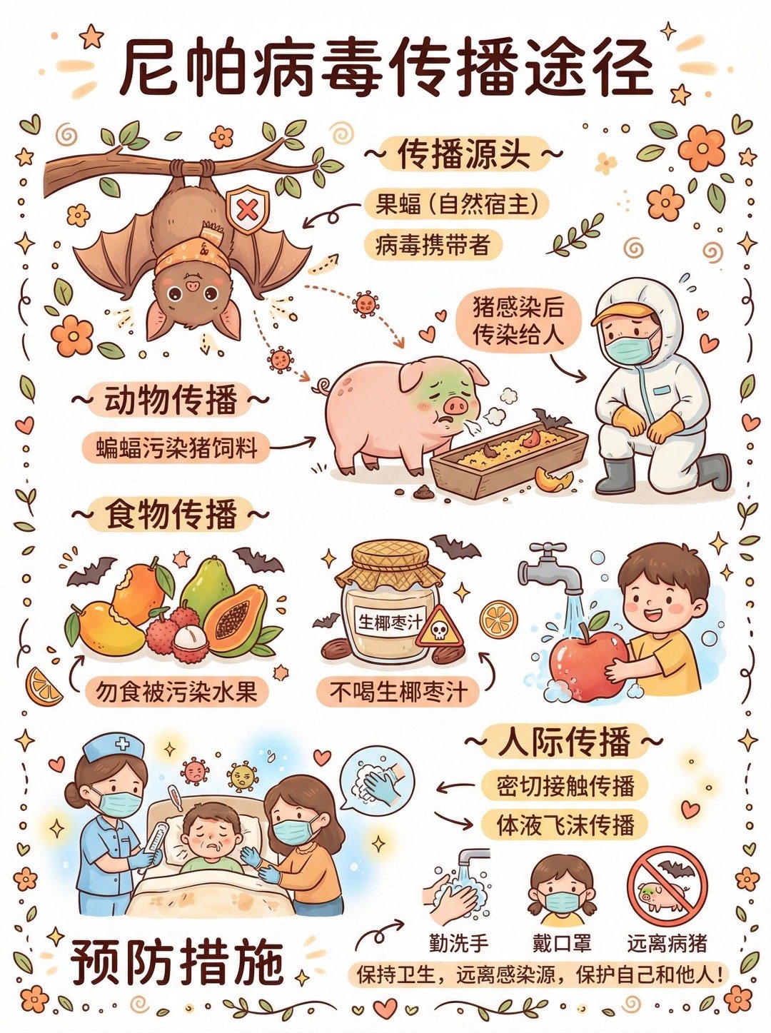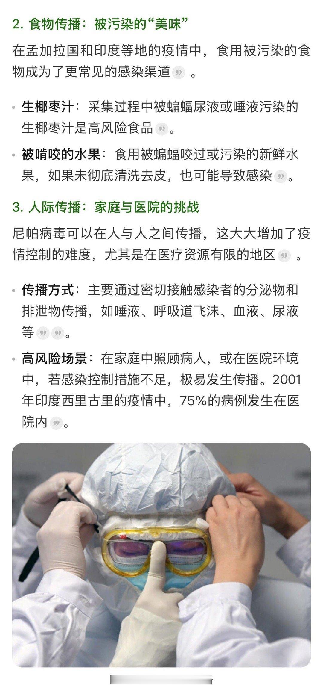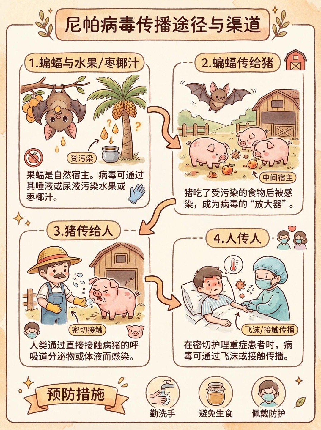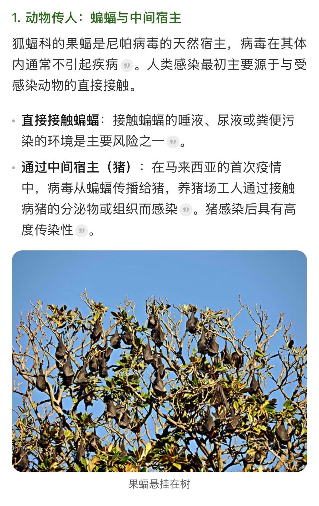 泰国果蝠体内发现强毒性尼帕病毒很多人听到尼帕病毒后的第一反应是: “这离我应该很远吧?” 从目前情况来看,这个判断并不算错。 尼帕病毒的主要传播链,并不是日常社交。 它更多和特定地区、特定动物接触、特定饮食习惯有关。 对普通城市居民来说,日常生活中直接感染的概率极低。 但这并不意味着可以完全忽视。 因为公共卫生的风险,从来不是“现在有没有”,而是“未来会不会”。 病毒跨物种传播,本身就充满不确定性。 我们真正需要做的,其实不是焦虑,而是保持基本认知: ✅ 不迷信偏方 ✅ 不传播未经证实的消息 ✅ 不被情绪化内容牵着走 安全感,很多时候不是来自“什么都不会发生”, 而是来自“即使发生了,我也知道该怎么判断”。 尹烨谈尼帕病毒卷土重来