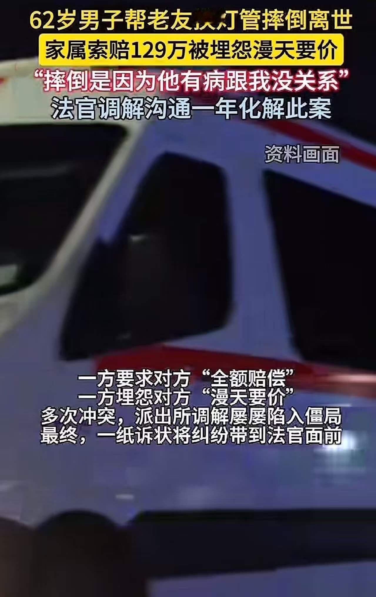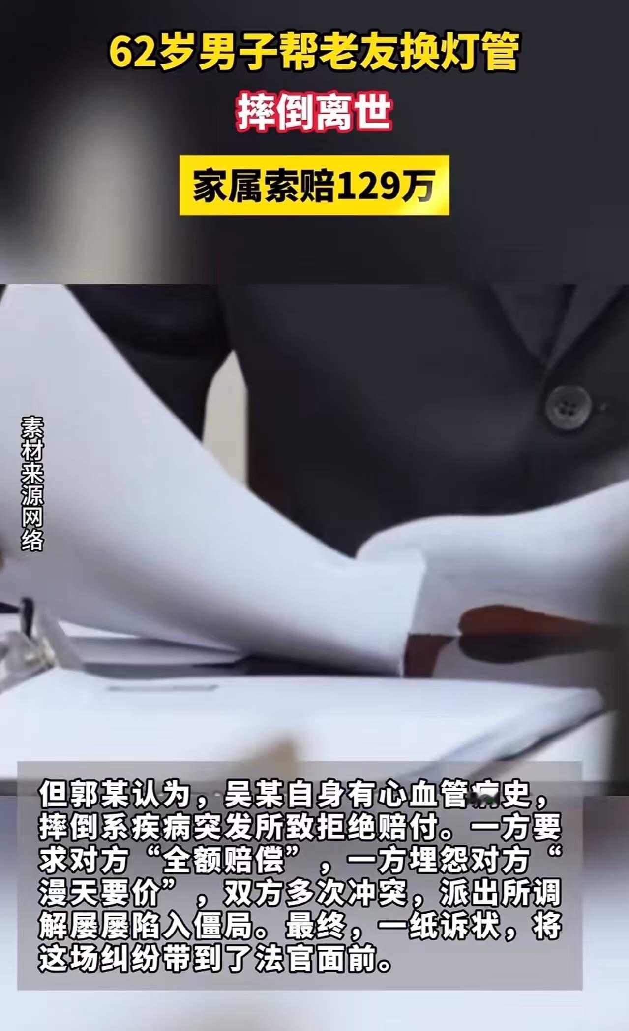 62岁男子帮老友换灯管,不慎摔倒离世,家属索赔129万!一方要求“全额赔偿”,一方埋怨“漫天要价”!男子妻子:“我老公是你叫去换灯管的,事因你而起,现在人都走了,你倒是撇得一干二净。”那么法院会怎么判呢? 当一场普通的“帮忙换灯管”演变成一场悲剧,社会的目光不由得被拉向了人性与责任的深层次探讨。62岁的男子,为了帮老友一时心软,毫无防备地站在了危险的高空,结果一不小心摔倒,永远离开了这个世界。而他的家属,面对突如其来的巨大损失,选择了追责,索赔129万元。 这起事件引发的争议,远不止一份赔偿数额那么简单。有人指责“漫天要价”,有人则认为“责任应由对方承担”。男子妻子一句话犹如重锤,击中了许多人的心:“我老公是你叫去换灯管的,事因你而起,现在人都走了,你倒是撇得一干二净。”这不仅是对责任归属的质问,更是对人性善恶的拷问。 在这个事件背后,我们能看到什么?一方面,是社会中普遍存在的“谁该负责”的责任感迷失;另一方面,是人们在面对突发悲剧时的情感反应——愤怒、悲伤,甚至是无奈。这个案件折射出一个深刻的问题:在现代社会中,我们每个人都在“责任链”上扮演着角色,但当意外发生时,究竟谁该为之买单?是善意的帮忙者,还是被请求人?还是法律的天平? 法院的判决,或许会在责任认定、赔偿额度上做出平衡,但更值得深思的是:我们是否在这个过程中,忽略了人性的温暖与社会的责任?当有人因一时的善意陷入无法弥补的痛苦时,我们是否也应该反思:在关系与责任之间,如何找到那条既保护弱者,又不滥用法律的“合理界限”? 这起案件提醒我们,每一次“帮忙”,都应有安全的保障,每一份“责任”,都应有合理的界定。社会的温度,正是在这种责任与善意的平衡中不断升华。希望在法律的裁决之外,我们每个人都能多一份理解与宽容,让这个社会变得更加温暖。因为,无论风雨,善意永远是我们最坚实的底线。离世索赔 换灯泡奇事 提灯定损赔偿