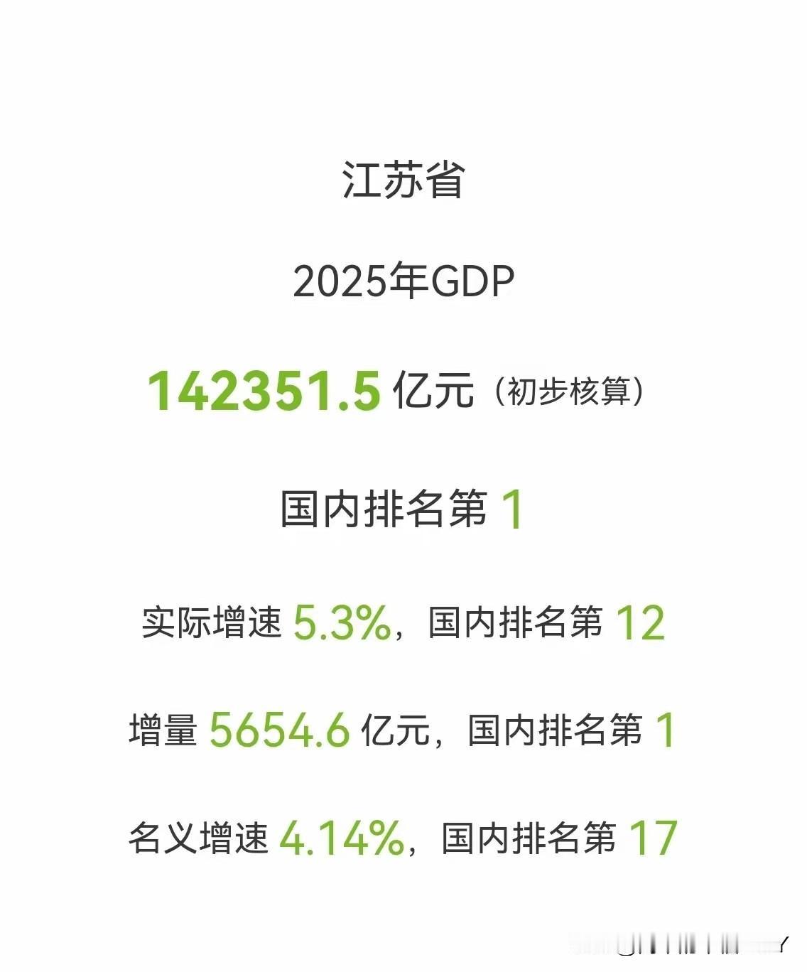 广东第一不保了!2025年江苏省GDP142351亿,和广东只差3500亿了! 2025年,江苏以5.3%的增速往前冲,广东则是3.9%的步调。一快一慢之间,藏着追赶的底气。去年两省还差4600亿,今年就缩到3500亿左右,硬生生追回来1000亿。 照这势头算下去,三年光景,江苏说不定就能追上广东,国内经济第一省的宝座,怕是要换主人了。 有人说,这就像跑马拉松,广东领跑了几十年,江苏在后头咬得越来越紧。广东靠的是改革开放的先发优势,珠三角的科创火苗、外贸的全球触角,都是它的撒手锏。 可江苏的牌也硬——制造业根基扎得深,十三座城市个个有绝活,苏南的电子信息、苏中苏北的装备制造,齐头并进的架势,像支训练有素的队伍。 增速差里藏着门道,5.3%对3.9%,看似不起眼的数字,累积起来就是不小的差距。江苏这几年抓实体经济不放,高新技术产业占比逐年涨,县域经济更是遍地开花。 昆山、江阴这些地方,GDP比不少地级市还强。这种均衡发力的路数,让它跑起来稳当得很。广东当然也不弱,大湾区的协同效应越来越显,深圳的科创、广州的商贸,依旧是金字招牌。 只是庞大的体量想保持高速增长,本就比小个子难。就像大轮船转弯慢,江苏这艘中型舰,灵活劲儿反倒成了优势。 老百姓不管谁是第一,只看日子实不实。江苏的工厂里岗位多,广东的市场上机会多,两省你追我赶,受益的还是普通人家。 说不定哪天江苏真超了广东,也不是谁输谁赢,而是中国经济多了个更强的引擎。三年时间说长不长,说短不短。中间可能有新的变量,政策的调整、产业的转型,都可能改变节奏。 但至少现在,江苏追赶的势头正猛,广东也不会坐视不理。这场较量,本身就是中国经济活力的写照。不管最后谁先谁后,有这股你追我赶的劲头,就错不了。 毕竟,发展的赛场,从来不怕高手过招,就怕没人敢往前闯。江苏和广东的比拼,还会继续,而这背后,是整个国家向上的力量。