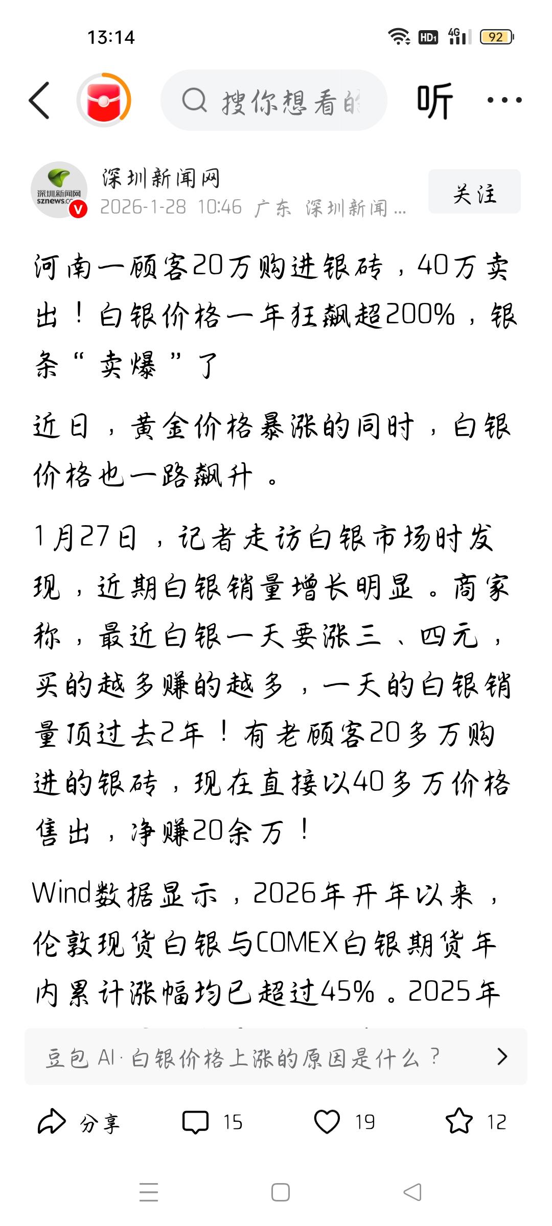有顾客20万买一块银砖40万卖出,我想说 据新圳新闻网报道,近日,黄金暴涨,白银也在飙升,白银在2025年至今已涨200%,在新圳白银销售额大幅攀升,有一位河南顾客20万买了一块银砖,40万卖出,我想说,这位顾客肯定不是最近买的,肯定是前几年买的,现在卖出肯定赚了。但是现在白银已处于高位,如果再买,就必须再创新高。白银可以屡创新高吗?个人认为,高处不胜寒,如果一旦下跌,咱们就被割了韭菜。所以,现在买白银,还是要谨慎。各位条友觉得呢?