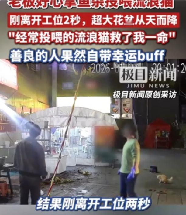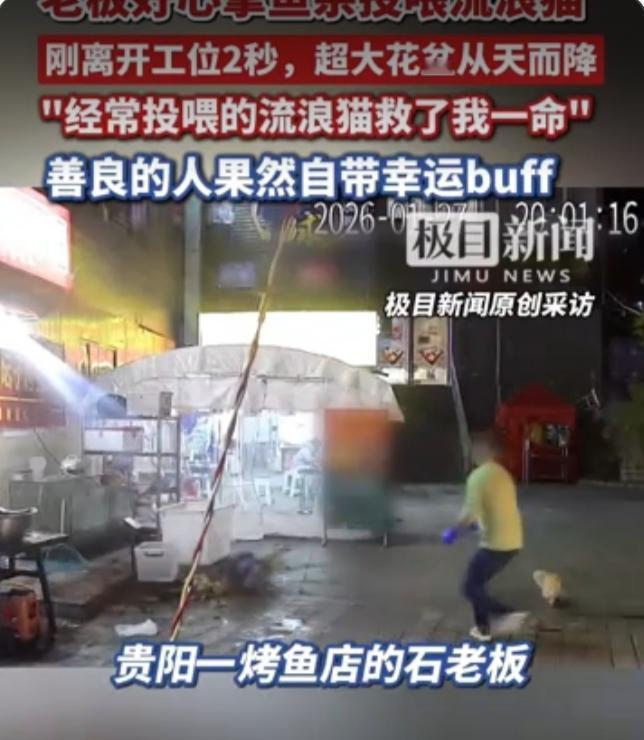 老板好心拿鱼杂喂流浪猫,离开工位2秒躲过高空坠落的花盆捡回一命,网友: 好人有好报 监控画面里的那2秒,足以改写一个人的一生。贵州贵阳这位烤鱼店老板石先生,只是习惯性地拿起刚处理好的鱼杂,走向门口徘徊的流浪猫——这是他一个多月来的日常,每当这只小猫来觅食,他总会分出一份善意 。可谁能想到,就在他转身离开的瞬间,一个重达十余斤的花盆轰然坠落,正好砸在他刚才站立的位置,不锈钢盆被砸得变形,花盆碎片溅了一地,让人看得脊背发凉。 事后石先生回想起来仍心有余悸,这只每天来“蹭饭”的流浪猫,竟成了他的“救命恩人”。而这场惊险的意外,其实藏着两个值得深思的真相。一方面,是善良带来的幸运并非偶然——石先生不仅长期投喂流浪猫,家里还养着宠物狗,事发后更决定给这只流浪猫置办猫舍,甚至愿意接收更多流浪动物提供鱼杂喂养,这份发自内心的柔软,让他在不经意间避开了致命危险。就像网友说的:“你对世界温柔,世界终会对你温柔以待”,善良从不是无用的消耗,而是命运悄悄埋下的彩蛋。 另一方面,高空坠物的隐患更该敲响所有人的警钟。此次花盆坠落虽非故意抛物,而是员工维修探照灯时意外碰落,但十余斤的重物从高空落下,若击中人体后果不堪设想 。联想到武汉曾发生的招牌脱落砸伤路人案,法院明确判定经营者需承担主要责任,因为高空物件的日常检查、隐患排除本就是所有人的义务 。我们身边的阳台花盆、空调外机、商铺招牌,都是悬在头顶的“定时炸弹”,多一次检查加固,就少一次意外发生。 这起事件之所以让人动容,不仅是因为“好人有好报”的美好结局,更因为它让我们看到:善良从来都不是单向的付出。石先生用鱼杂温暖了流浪猫,而小猫的到来,恰好为他避开了灭顶之灾;就像孙俪收养《甄嬛传》里的流浪猫,不仅给了小动物一个家,也让舅公在陪伴中走出伤痛 。生活中的善意,从来都不会凭空消失,它会以各种方式回馈给你,可能是一次化险为夷,可能是一份不期而遇的温暖。 此刻不妨问问自己:多久没给身边的陌生人一个微笑?多久没对流浪的小动物多一份怜悯?其实善良很简单,可能是随手捡起的垃圾,可能是公交上的一次让座,可能是对需要帮助的人伸出的援手。就像石先生的经历告诉我们的:你付出的每一份善意,终会在未来的某一天,以意想不到的方式照亮你前行的路。 你有没有过因为善良而收获幸运的经历?欢迎在评论区分享你的故事,让我们一起传递善意,温暖这个世界~#高空坠物的隐患##救命流浪猫##善良收获幸运的故事