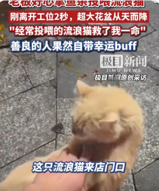 老板好心拿鱼杂喂流浪猫,离开工位2秒躲过高空坠落的花盆捡回一命,网友:好人有好