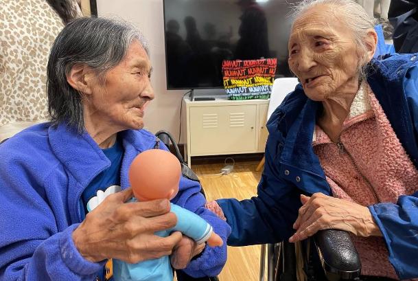 理查德·哈灵顿 (Richard Harrington) 拍摄于 1949 年的珍贵黑白照片,照片中,作者的祖母海伦·阿加图克·科内克 (Helen Agaaqtuq Konek) 在加拿大努纳武特地区阿尔维亚特她们因纽特家庭的冰屋里抱着她年幼的妹妹,生动地展现了那个时代在被迫迁往永久定居点之前游牧生活的艰辛。 与这张照片并列的是一张拍摄于 2022 年的彩色照片,照片中,这对姐妹如今已是九十多岁高龄,在渥太华的一家养老院里,她们微笑着,手里抱着一个玩偶。两张照片的对比突显了在加拿大不断发展的原住民社区中,这个家庭73年来所展现出的坚韧不拔和文化适应能力。