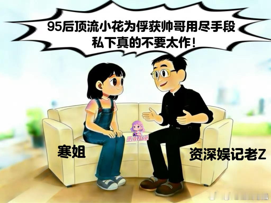 曝95后顶流小花逼顶流小生分手寒姐的漫画又来了,这次爆料的是95后顶流小花特别喜欢帅哥,为了和帅哥搭戏用尽手段。这位小花曾逼顶流小生和女友分手,逢人便说自己才是正牌女友。参加活动的时候二人同座,小生无奈加回联系方式,小花自作多情反被怼。