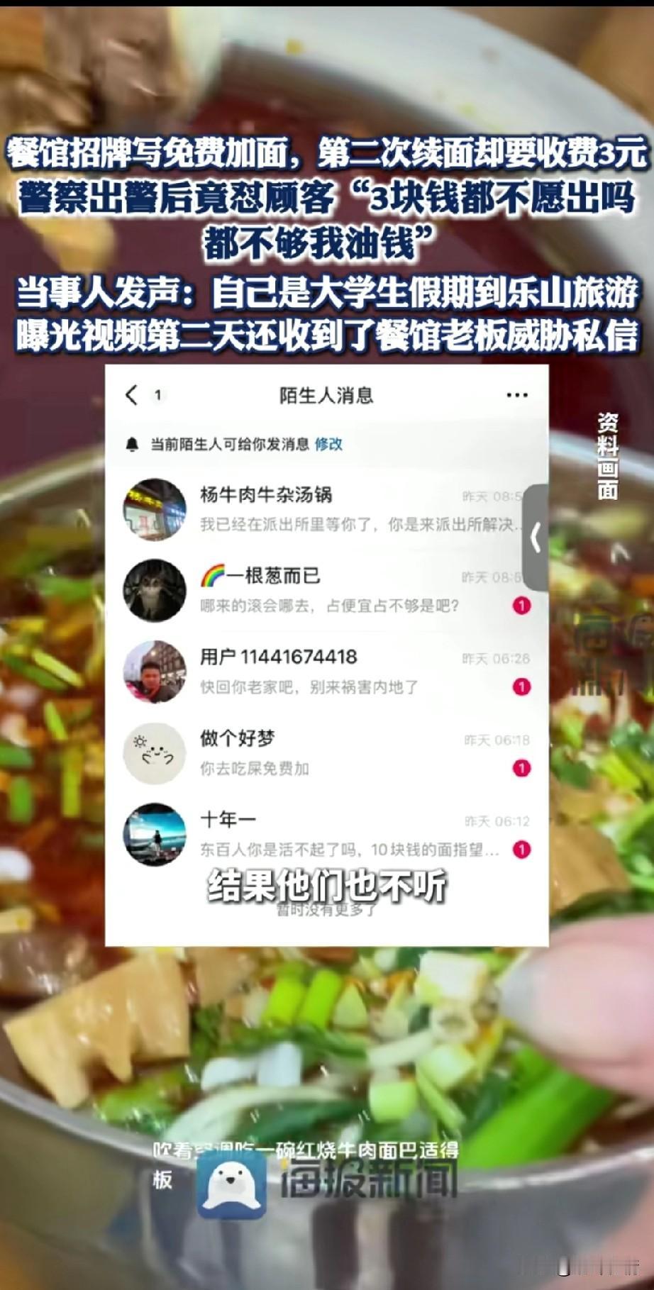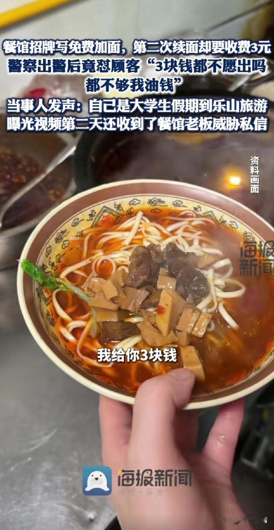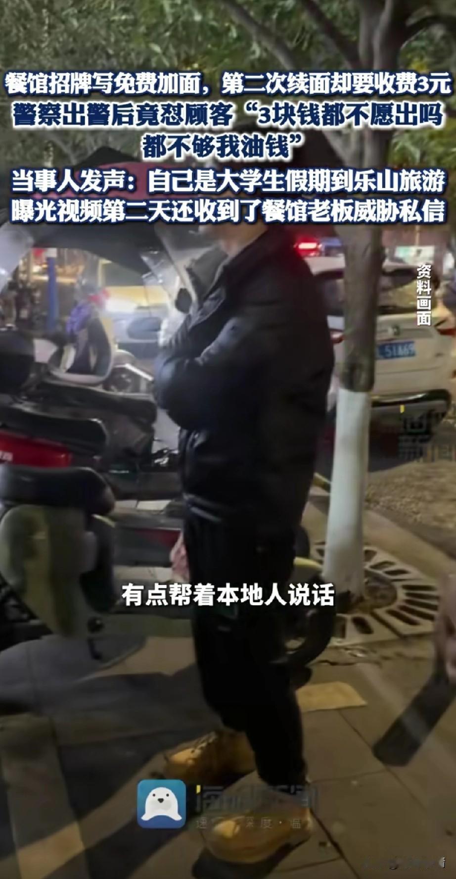 大学生去四川乐山旅游,就在乐山吃了碗面,结果却被店主赶走,还收了人家的碗! 这事直接上了热搜,出校第一课,遇到叔叔处理问题,他直言叔叔有些偏袒地方人,这让他有些气愤! 原来大学生和朋友一块去乐山旅游,因为饥饿就在一家面馆吃面,招牌上写着可以免费加面, 正在长身体的大学生看着一碗汤汤水水的面根本吃不饱,于是加了一次面,结果第二次见面的时候直接被老板娘怒斥, 再加面就要加三块,大学生告诉她你牌子上写着免费加面,老板娘被激怒了,直接把大学生的碗都收了! 这样的行为也激动了大学生,当大学生要拨打12345的时候,老板娘直接报叔叔了, 叔叔很快赶到现场 ,在了解完事情的缘由之后,直接怒斥大学生,多掏3块钱,你都不愿意,我给你付了,来一趟还不够我的油费! 这让大学生很生气,根本就不是3块钱的问题,明明是她招牌上说可以免费加面,吃的时候就不让加了,我第二次加她直接就开始怼我! 我是来四川乐山旅游的,不是来这里受气的,老板娘表示自己是做小本生意的,根本搁不住你这样吃! 大学生反驳到,我就第二次加面,又不是要一直加面,如果你不允许第二次见面,你可以在招牌上写,第二次见面要收费呀!这样不就好了吗? 最后老板娘也懒得和大学生争执了,直接给了大学生10块钱,让他离开,第二天大学生将这事发到了网上, 没想到居然收到了老板娘的威胁,大学生也表示自己根本不差那10块钱,就是这事让他很生气! 大家对于大学生在四川乐山加面被上课这事怎么看? 四川 旅游就是受罪你认同吗 乐山餐饮店