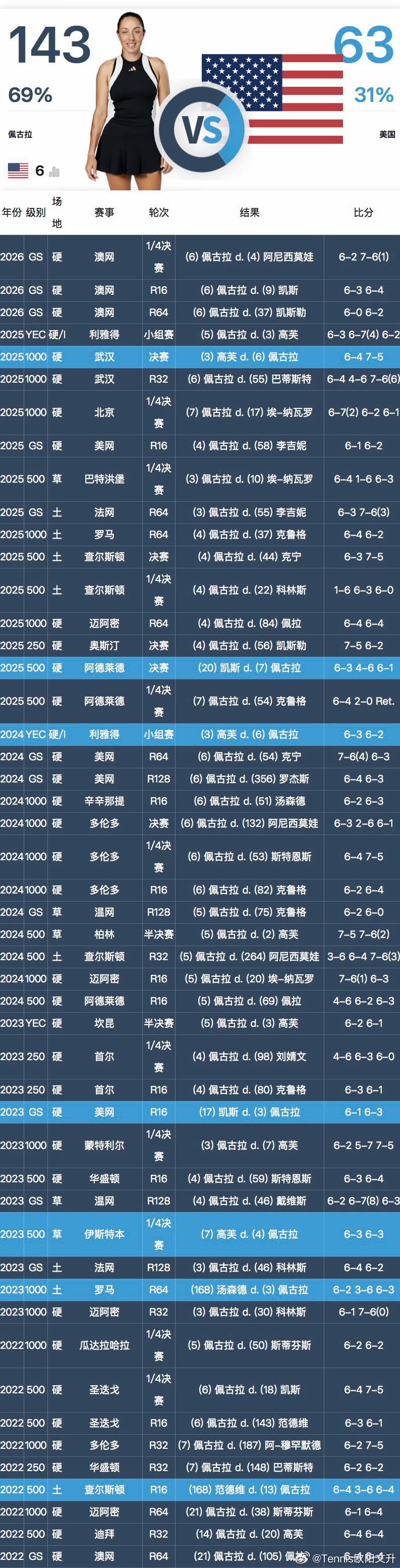 🇺🇸佩古拉vs美国球员交手记录可以算内战女王👸🏻吗?佩古拉首进澳网四强澳网2026