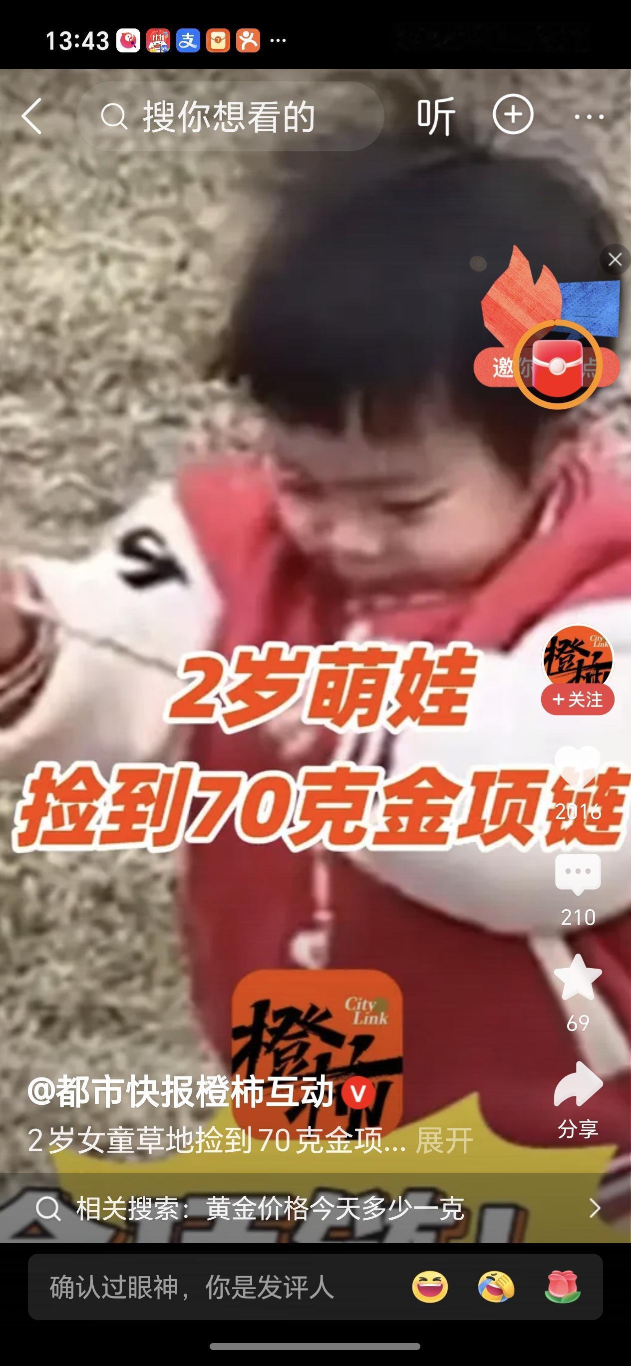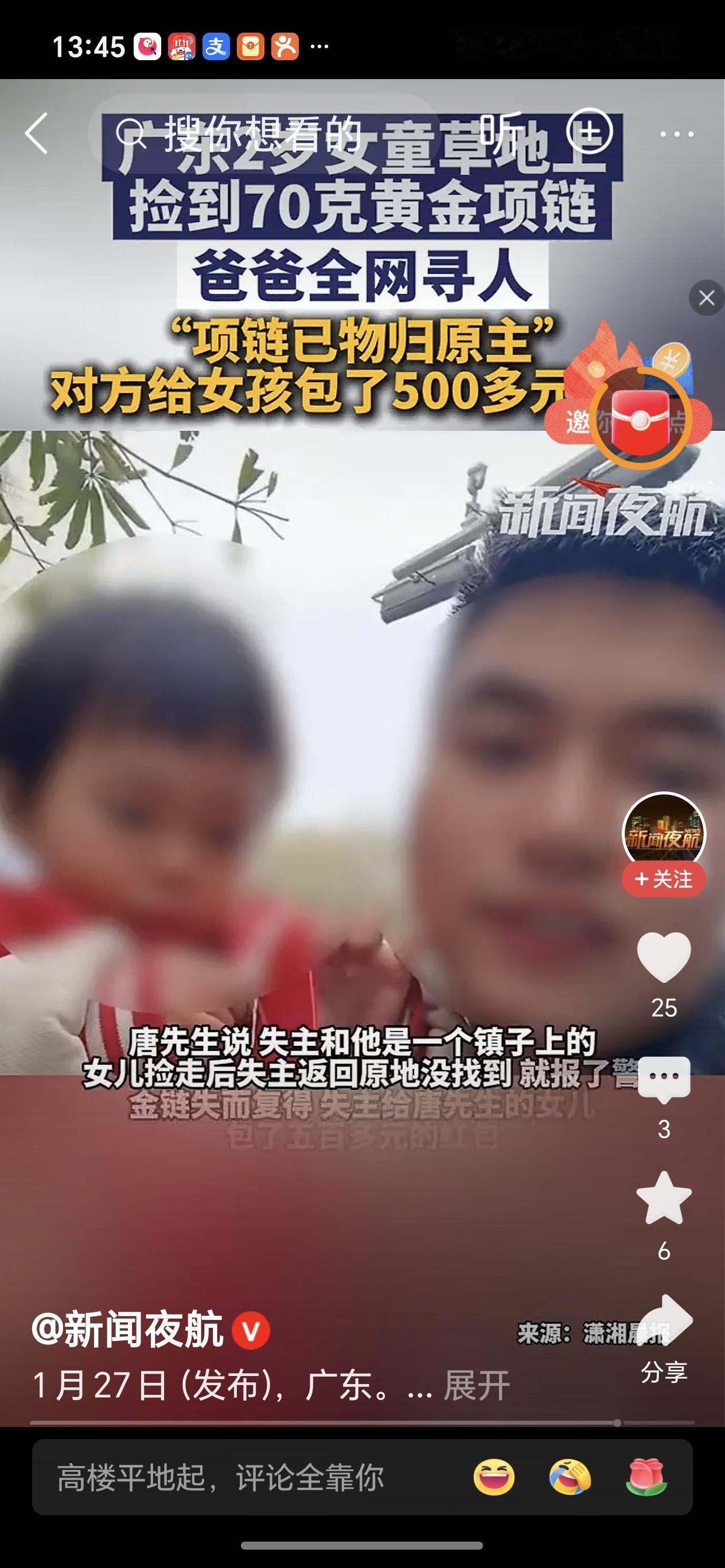 如今的金价,捡到那么大一条项链还主动寻找失主,不为所动,这种拾金不味的精神值得点赞,这对父女太纯朴善良了,祝福他们好人一生平安!