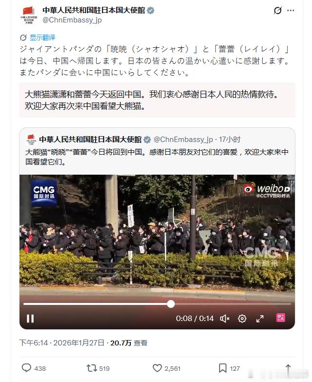 中国驻日本国大使馆发文称:大熊猫“晓晓”“蕾蕾”今日将回到中国。感谢日本朋友对它们的喜爱,欢迎大家来中国看望它们。日本进入无大熊猫时代日本民众含泪与大熊猫再见旅日大熊猫回国