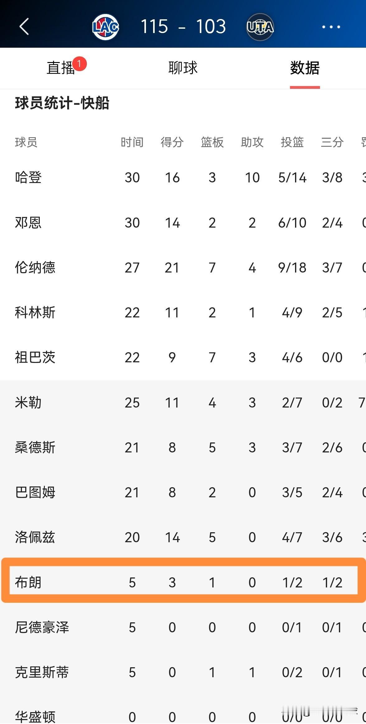 快船悍将科比-布朗真是上场必能得分!在今天快船客场以115:103战胜爵士的比赛中,布朗在球队胜局已定的情况下替补出战5分钟,三分球2中1得到3分,还有1篮板。 我发现在快船的最近几场比赛中,只要布朗能够获得上场机会,他必能得分,布朗好像天生拥有得分的欲望,只要布朗上场之后,他的眼里只有篮筐。