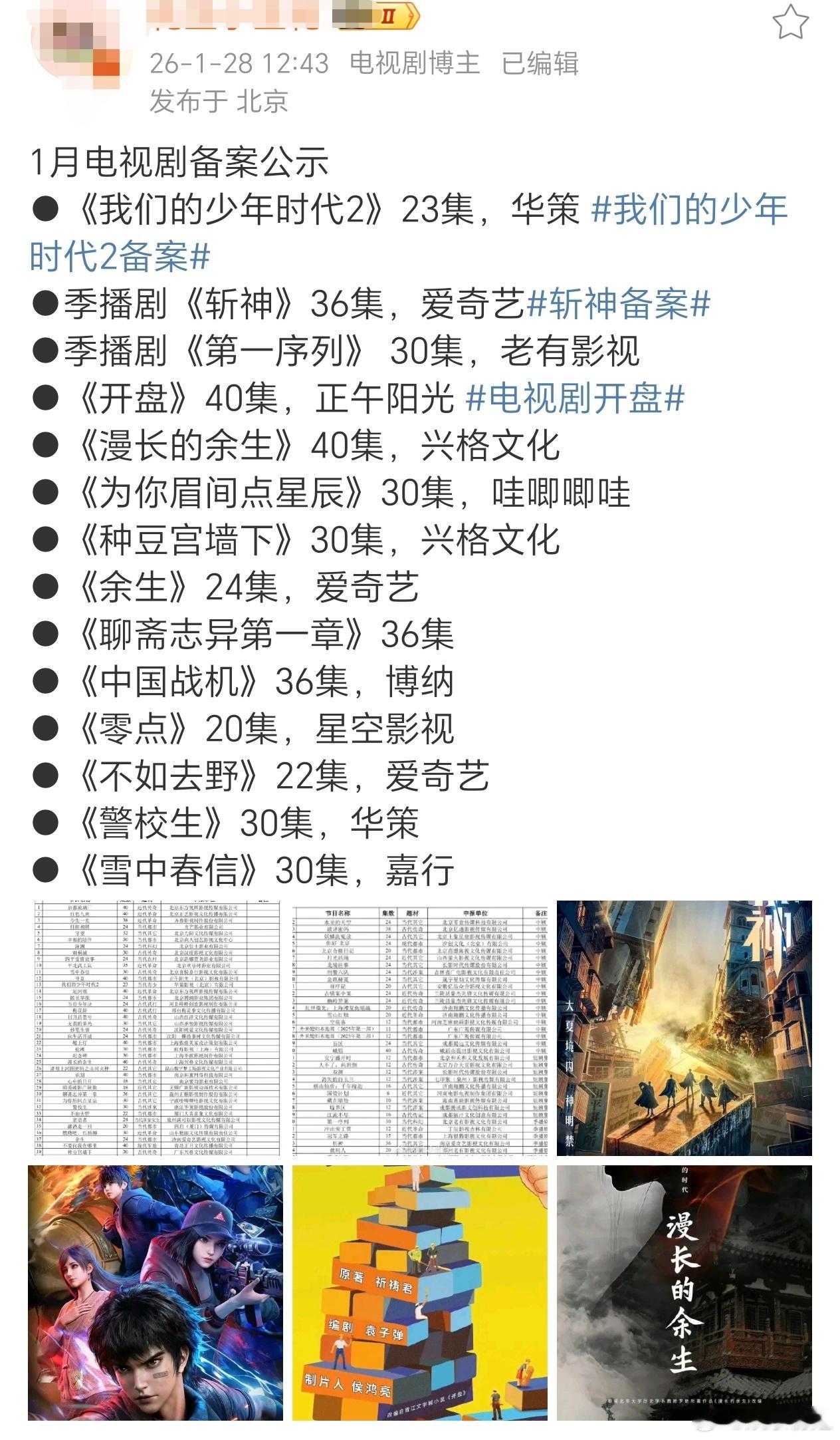 1月备案公示电视剧 2026年1月备案公示电视剧:《我们的少年时代2》《斩神》《第一序列》《开盘》《漫长的余生》《为你眉间点星辰》《种豆宫墙下》《余生》《聊斋志异第一章》《中国战机》《零点》《不如去野》《警校生》《雪中春信》......每一部都好期待啊2025微博之夜爆款创作大赛