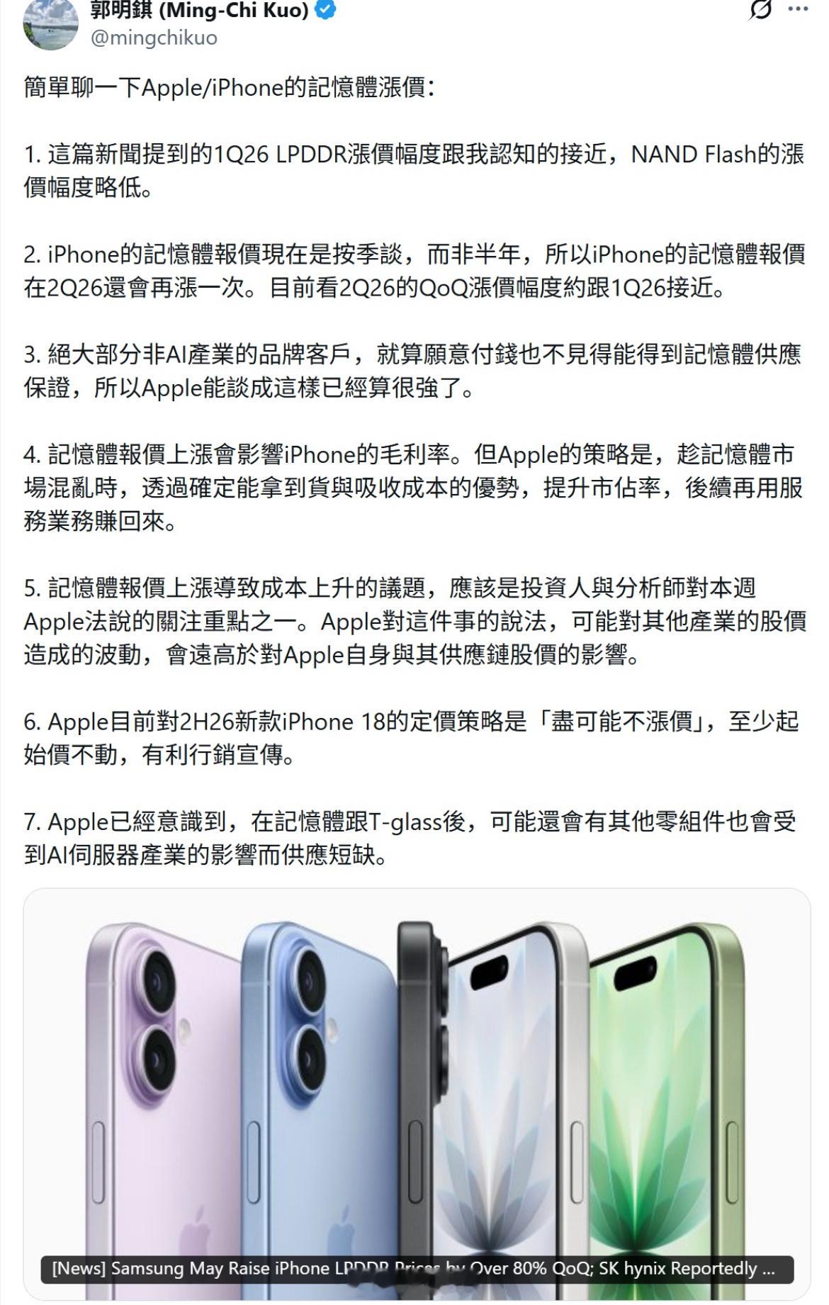 iPhone18有望不涨价郭明錤预测,苹果 iPhone 18 系列起售价与前代持平。在 2026 下半年推出的 iPhone 18 系列上,苹果公司制定了明确的定价策略:尽可能避免涨价,至少保持起售价与前代持平,如果苹果真能不涨价,下一代销量更起飞,就看内存涨价让谁承担了。