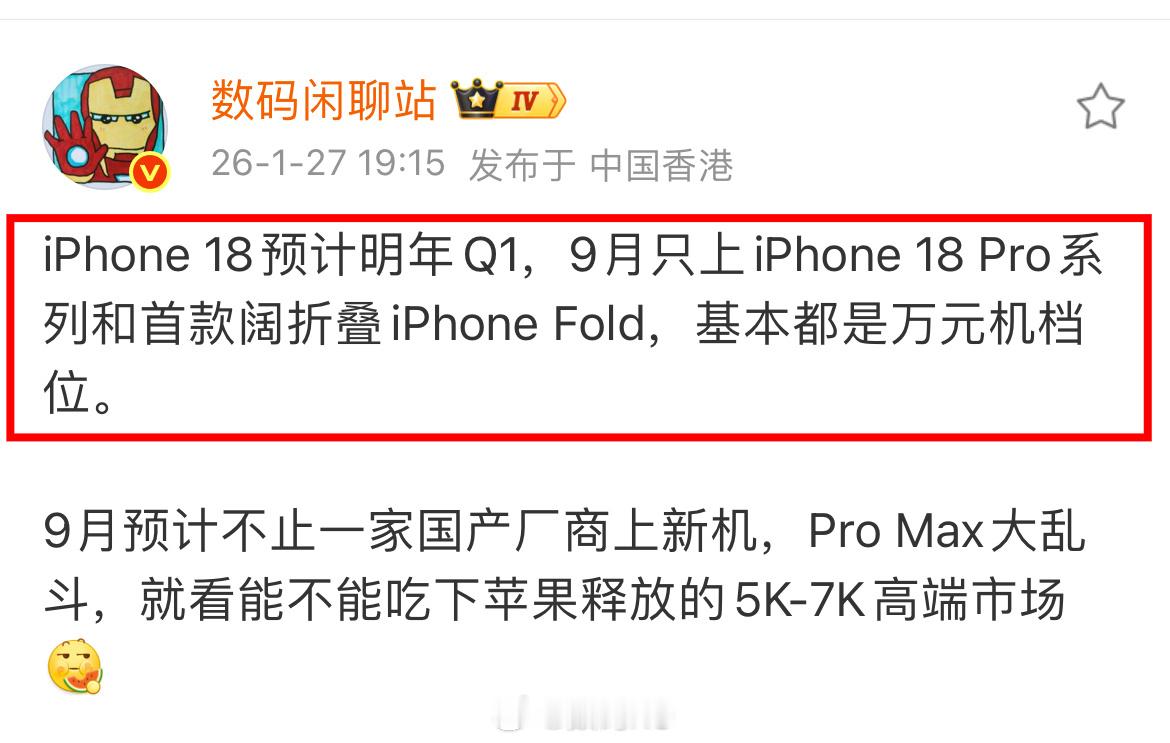 iPhone18标准版或明年发布苹果手机发布会也要分一年两次了,吃全年热度,iPhone 18预计明年 Q1,9月只上iPhone 18 Pro 系列和首款阔折叠iPhone Fold,9月热闹起来了