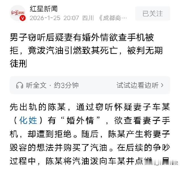 广东,一男子跟酒吧里一个女服务员好上了,俩人还有非正当的关系。男子妻子发现之后,妻子为了4个孩子选择忍耐。谁知道男子自己犯错,还怀疑妻子在外面有人,就安装了个窃听器,果然发现妻子跟他人发暧昧语音。男子非常生气,就在车里询问妻子,索要手机查看。妻子拒绝,并且立刻下车。谁知道,男子直接用汽油浇在妻子身上,妻子就这样被弄没了。 (本新闻来源:红星新闻) 据报道称,男子犯事后被抓,但是面临判刑,他又开始狡辩,说自己只是激情犯罪。不过,相关部门可不这么认为,最后男子也得到了应有的惩罚。 一男子陈某,品行不咋地,经常跑去酒吧喝酒,竟然跟一个陪酒的女服务员好上了,两个人甚至还发生了那样的关系。 之后陈某的心思就一直在这个女服务员的身上,经常聊暧昧的信息。这件事很快就被自己妻子车女士知道了。 本来二人的感情确实也已经破裂了,但是车女士给陈某生下了4个孩子,当时车女士心想:为了孩子,就忍了吧,能过过就行,将孩子拉扯大再说吧。 就这样,忍受了4年,车女士对丈夫的感情也是达到了冰点,两个人就是搭伙过日子而已。谁知道,丈夫却开始刁难。 陈某咬定妻子:“这么多年来对我爱搭不理的,这个女人肯定是外面有人了。” 正想着呢,陈某就购买了一个窃听器安装在家里,之后,还真的被她听到妻子跟其他人暧昧的信息。 其实,也就这两句话语气比较好,男子就认定妻子不忠,听起来挺好笑的。而且,找三姐的,可是你自己啊。 陈某可不管,直接就在汽车内询问妻子:“你到底有没有在外面找人?” 正说着呢,男子还要去抢夺妻子的手机,并且让妻子说出密码打开手机。但是车女士不肯,感觉对方无理取闹,直接就下车准备离开。 陈某这下可生气了,直接就拿出一个饮料瓶,去装了800毫升的油气,然后朝着自己的妻子就开始倾倒。 当时车女士开始反抗,并且试图挣脱,但是仍然没法摆脱丈夫。陈某直接就将自己的老婆给弄没了。(烧了。) 眼看着火尽,陈某看到妻子倒地不起,而且也没了气息,这时陈某才算是慌了神。他害怕要担责,立刻就跑去自首,想着:“如果我自首的话,是不是可以轻判呢!” 陈某被抓后,经过一番审定,判定陈某无期徒刑。 听到这样的判定,陈某不服,辩称自己是激情伤人,不应该判这么重。 二审的时候,判定非常仔细。第一,陈某拿不出老婆外面有人的证据,但是却贼喊抓贼。 第二,陈某提前购买了油气,之后还将油都泼在妻子要害处,之后故意将妻子给弄没了。这就是“主观恶性非常严重”,属于预谋性行为。 最后,二审维持原判,判定无期徒刑。 一、法律解释:什么是激情犯罪? 根据《刑法》规定,激情犯罪就是人在情绪失控的瞬间,做出了冲动的暴力行为。特点就是犯案缺乏预谋性。 但是很明显,男子的行为存在预谋性,提前去购买了工具,并且还专门针对妻子的要害处进行伤害,他的行为不属于激情犯罪,还需要承担刑事责任。 二、男子有预谋性的行为,购买犯罪工具,专门针对妻子的要害处,最后造成妻子离世,男子的行为将会面临怎样的惩罚? 根据《刑法》第二百三十二条规定,有预谋性的故意杀人,手段非常残忍、造成严重的后果,此举已经构成故意杀人罪,会被判处无期徒刑、甚至死刑。 从本案来看,男子陈某有预谋性,专门购买了工具,针对妻子的要害处伤害,完全不属于情节较轻的情况,已经构成了情节非常恶劣的罪行,会被顶格处罚。 即便陈某最后主动认罪、自首,但是其罪行过于恶劣,完全超出了可以忍受的范围,因此往往会面临非常严厉的惩处。 这件事,闹到最后,还是苦了孩子。4个孩子,妈妈没了,爸爸进去了,这之后孩子们该怎么活下去呢?真的是一辈子阴影。 婚姻也是,因为是相伴一生,所以尽快要去遇到对的人。当对方犯错的时候,是时候及时止损,遇到差劲的人就赶紧离开。 看完本案,大家内心都作何感受呢,不妨一起来讨论吧。