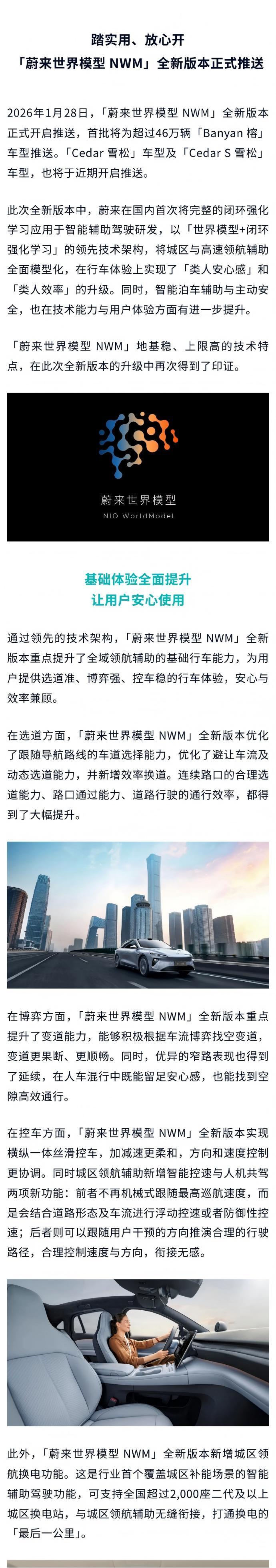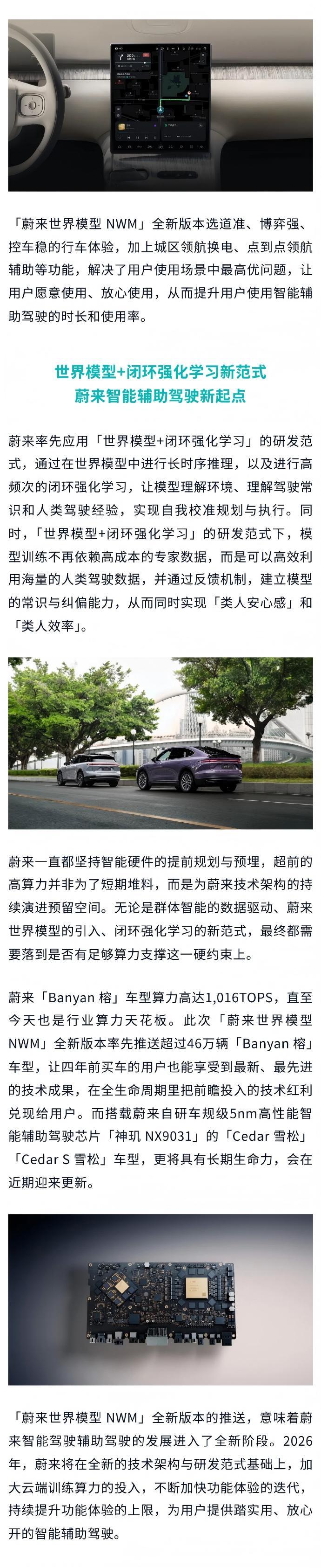 【蔚来世界模型 NWM 新版:智驾开始从“规则驱动”走向“世界理解”】蔚来宣布其智能辅助驾驶技术蔚来世界模型NWM全新版本正式开启推送。首批将为超过46万辆Banyan榕车型推送,Cedar雪松车型及CedarS雪松车型也将于近期开启推送 蔚来世界模型全新版本发布 核心变化不在“功能加了什么”,而在智驾底层逻辑的升级:🔹 从感知到理解新版 NWM 引入更完整的世界建模与时序理解能力,不只识别物体和车道,而是开始理解交通关系、行为意图和场景演化。🔹 强化学习 + 世界模型结合通过仿真与真实数据闭环,减少对规则和人工标注的依赖,让系统在复杂场景中具备更强的泛化与自我进化能力。🔹 复杂城市场景稳定性提升重点优化了路口博弈、异形车道、混行交通等高不确定性场景,目标不是“更激进”,而是更可预期、更像人类老司机。🔹 算力与模型协同演进NWM 与蔚来自研芯片和算力体系深度协同,世界模型开始成为智驾系统的“中枢”,而不只是一个辅助模块。智能驾驶