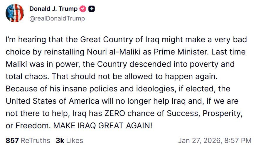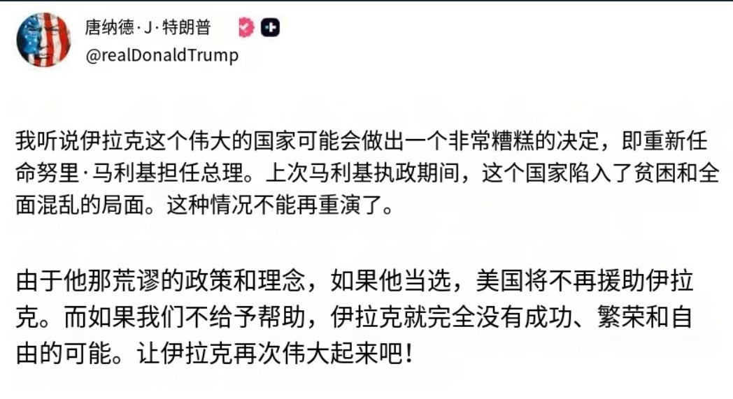 特朗普通过 Truth Social 发声:我听说伟大的伊拉克国家可能会做出一个非常糟糕的选择,重新任命努里·马利基为总理。上次马利基执政时,伊拉克陷入了贫困和彻底的混乱。这种情况绝不能再次发生。由于他疯狂的政策和意识形态,如果马利基当选,美国将不再援助伊拉克。如果我们不在那里提供帮助,伊拉克将毫无成功、繁荣或自由的机会。让伊拉克再次伟大!热点现场海外新鲜事国际局势