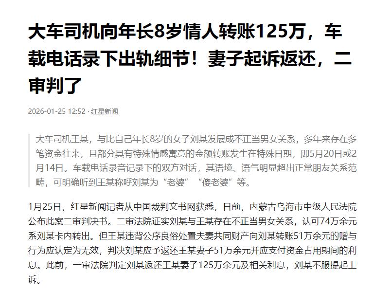 内蒙古乌海,一大车司机出车路上寂寞难耐,背着妻女,与年长8岁的女子发展成情人关系,而且长达十几年。妻子偶然通过车载电话听到,他叫对方为 “臭老婆”,这才得知被背叛。男子不想让家散了,给妻子写下保证书,承诺和对方一刀两断,回归家庭。但女子一查,竟发现丈夫给对方转账高达125万余元。自己在家省吃俭用,他对其他女人却挥金如土,这口气她咽不下。妻子一怒之下将第三者告上法庭,要求还钱。 一句亲昵的 “臭老婆”,像一根针,戳破了十几年的婚姻泡沫。任谁也想不到,那个在外跑运输、看着憨厚老实的丈夫,竟藏着这样的秘密,还是一藏就是十几年。 大车司机的工作,本就是聚少离多。车轮滚滚跑遍四方,驾驶室里的寂寞,是外人难以体会的。但寂寞从不是背叛的借口,更不是十几年心安理得出轨的理由。 妻子守着家里的一方天地,照顾老人,养育女儿,把家里的大小事打理得井井有条。她以为自己守的是一个安稳的家,却不知丈夫早已把温柔和偏爱,给了外面的人。 车载电话的无心之听,成了压垮妻子的最后一根稻草。那声喊给别人的 “臭老婆”,比任何指责都刺耳,十几年的付出和坚守,在这一刻显得格外可笑。 丈夫得知事情败露,没有半分愧疚的担当,反而第一时间写保证书求原谅。轻飘飘的几行字,承诺一刀两断,仿佛十几年的婚外情,只是一场无关紧要的误会。 妻子本想为了家庭忍下这口气,只要丈夫真心回归,日子还能继续过。可当她查到转账记录的那一刻,所有的隐忍都化作了愤怒,125万余元,这个数字让她浑身发冷。 这125万,不是天上掉下来的,是丈夫跑运输一趟趟跑出来的血汗钱,是她在家省吃俭用,一分一厘抠出来的夫妻共同财产。她舍不得买新衣服,舍不得吃顿好的,他却对情人挥金如土。 十几年里,丈夫给第三者的转账,少则几百几千,多则几万十几万,流水记录密密麻麻,每一笔都像一记耳光,扇在妻子的脸上。她守着空房熬日子,第三者却拿着她家的钱,过着舒心的日子。 都说一日夫妻百日恩,可在这个大车司机心里,夫妻情分远不如外面的温香软玉。他一边享受着妻子操持的安稳家,一边享受着第三者的陪伴,把自私和贪心,发挥到了极致。 他以为自己做得天衣无缝,却忘了纸终究包不住火。车载电话的一个疏忽,让十几年的伪装彻底崩塌,也让他亲手毁掉了自己的家庭。 妻子的愤怒,不止是因为丈夫的背叛,更是因为自己的付出被全盘否定。她省吃俭用的背后,是想让这个家过得更好,可丈夫却把她的心意,变成了讨好第三者的资本。 换做任何一个女人,都咽不下这口气。于是她没有再忍,也没有再哭,而是选择拿起法律的武器,维护自己的合法权益。把第三者告上法庭,要求返还全部转账,这是她最硬气的反击。 可能有人会说,夫妻一场,何必闹得这么难看。可这不是难不难看的问题,是原则问题。丈夫擅自处分夫妻共同财产,赠与第三者的行为,本身就是违法的,这笔钱本就该还回来。 第三者年长丈夫8岁,明知道对方有妻有女,还与其保持十几年的情人关系,更心安理得地接受转账,她的行为,既违背了公序良俗,也侵犯了他人的财产权,本就不该得到法律的保护。 她以为自己得到了真爱和钱财,却忘了这些东西本就不属于她。天上不会掉馅饼,拿了别人的东西,终究是要还的。这场官司,从一开始,她就输定了。 而那个大车司机,此刻怕是悔得肠子都青了。他不想家散,却又管不住自己,既想享受家庭的温暖,又想拥有婚外的刺激,最后落得个鸡飞蛋打的下场,纯属咎由自取。 他的保证书,在125万的转账记录面前,显得无比苍白。就算他真的和第三者断了关系,夫妻之间的信任,也早已碎成了渣,再也拼不回去了。 十几年的婚姻,十几年的付出,换来的却是背叛和挥霍。妻子的遭遇,让人心疼,也让人敬佩。她没有沉溺在悲伤里,而是勇敢地站出来,为自己讨回公道。 在婚姻里,很多女人都会为了家庭选择隐忍,可隐忍换不来珍惜,只会让对方得寸进尺。遇到背叛,最该做的不是忍气吞声,而是像这位妻子一样,拿起法律武器,保护自己。 夫妻共同财产,是夫妻双方共同努力的结果,任何一方都无权擅自处分。不管是转账、买礼物,还是其他形式的赠与,只要是给了第三者,另一方都有权利要求返还。 对于这位乌海的妻子来说,就算最后把钱追回来了,婚姻也很难回到从前。但至少,她为自己讨回了公道,让背叛者和第三者付出了应有的代价,这就够了。 在这场婚姻的闹剧里,没有赢家。大车司机失去了家庭的信任,第三者失去了不义之财,妻子失去了十几年的美好期许。可这一切的根源,都是大车司机的自私和背叛。 婚姻从来都不是一个人的独角戏,需要两个人共同经营,彼此忠诚,互相珍惜。如果连最基本的忠诚都做不到,那这样的婚姻,终究只是一场空壳。