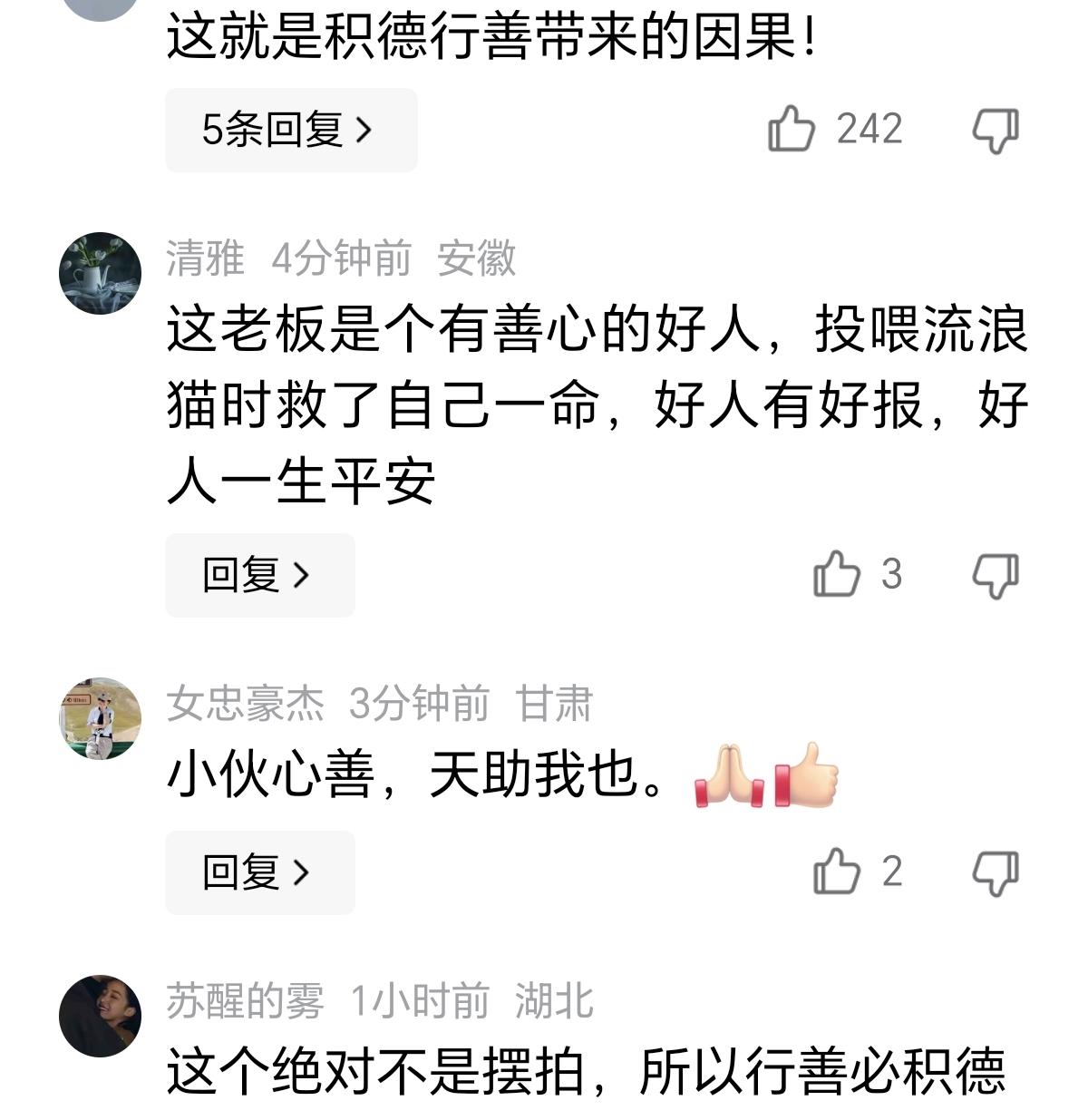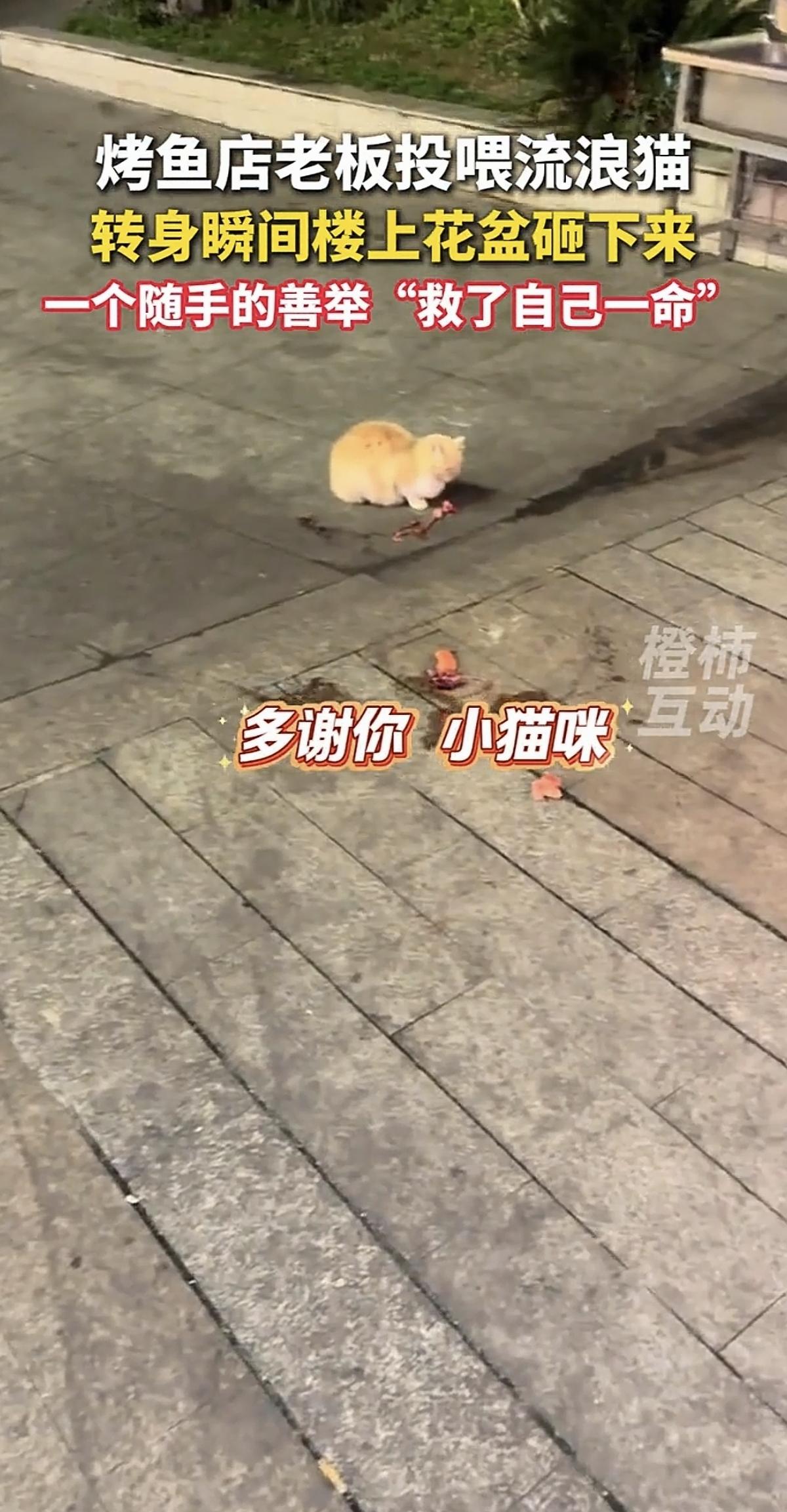“多谢,小猫咪!”烤鱼店老板因为好心那鱼杂投喂一只小橘猫,刚好躲过了楼上掉下来的一盆绿植。网友:果然好人有好报! 据报道,1月27日,贵州贵阳市,一位烤鱼店老板正在收拾鱼。 他怎么也不会想到,危险已经悄悄来临,而“救”他一命的竟然是一只不起眼的小橘猫。 事实上,这家烤鱼店老板平时就对那只小橘猫很不错,经常把鱼杂送给闻着味道来寻食的小橘猫。 这样说来,它们也算是“旧相识”了。 27日那天,烤鱼店老板还是像往常一样,拿了鱼杂去喂猫咪。 谁能想到,就在他刚起身之后的两秒钟,一盆绿植从楼上掉落,如果他不去喂猫,刚好会落在他头上。 好险啊! 这是碰巧了,但谁能说不是因为他的善良才让他躲过这突如其来的伤害呢? 有的网友说,平时还是应该多做好事,福虽未到,但祸已远离。 有的网友说,店老板平时喂小橘猫不会想到会有这么一天,发生这么一件事,看来就应该多行好事,莫问前程。 有的网友说,这肯定不是摆拍,所以行善必积德。 也许我们没有意识到,平时我们所做的每件事,一言一行,每一个决定,都是我们自身修养的外显,都是内心照进现实的投射,而有着怎样的内心与修养,无时无刻都在刻画着我们的生活,让我们成为现在的自己。 所以,我们平时应该多做好事呢,还是多做好事呢?